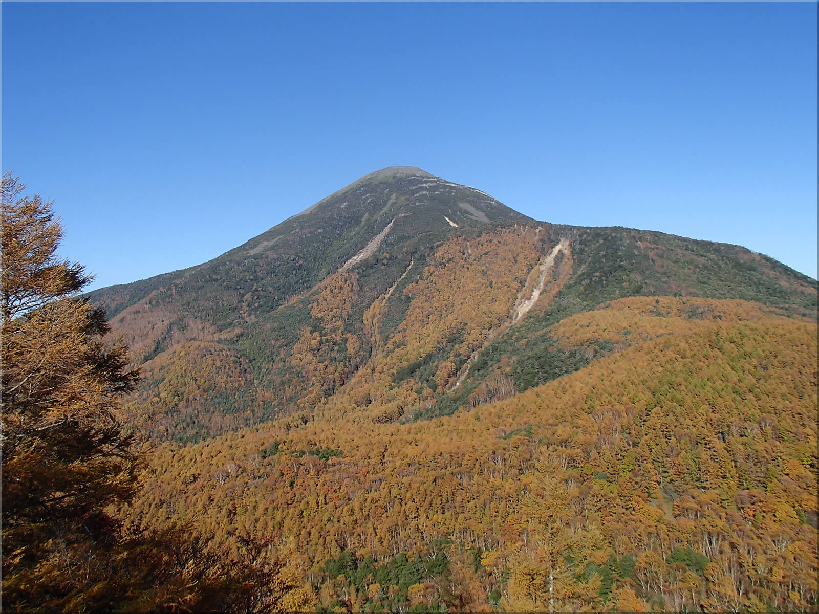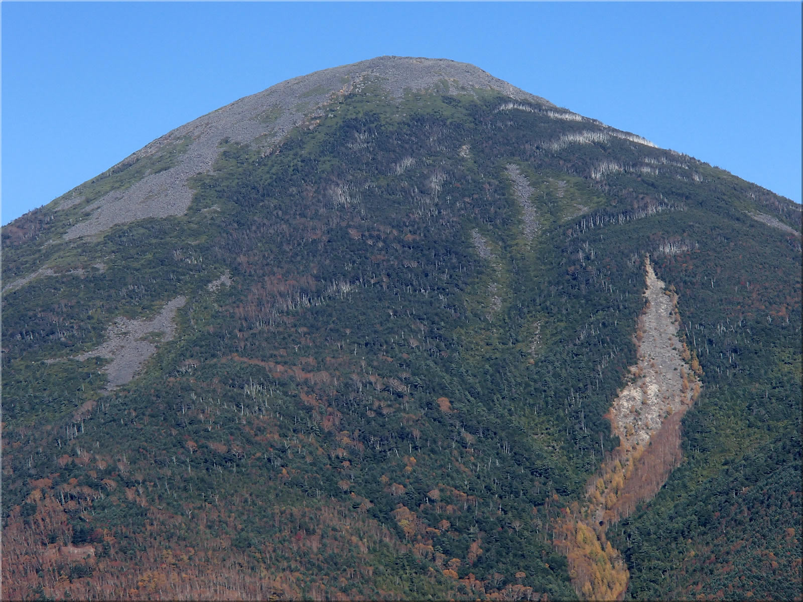 歩く度にどんどん蓼科山を見る角度が変わるので、少し歩いてはぱちりと本当に沢山の写真を撮ってしまいました(^^;。ここから見ると、右の尾根から黄葉の巨大な川が左側手前に流れ下っているようにも見えます。