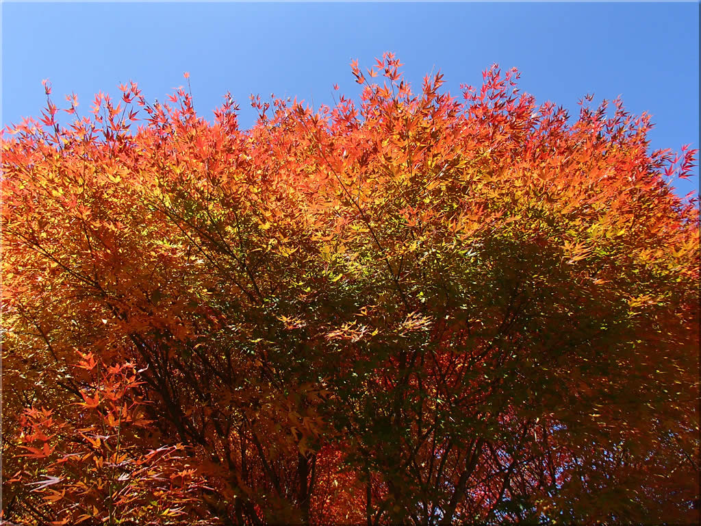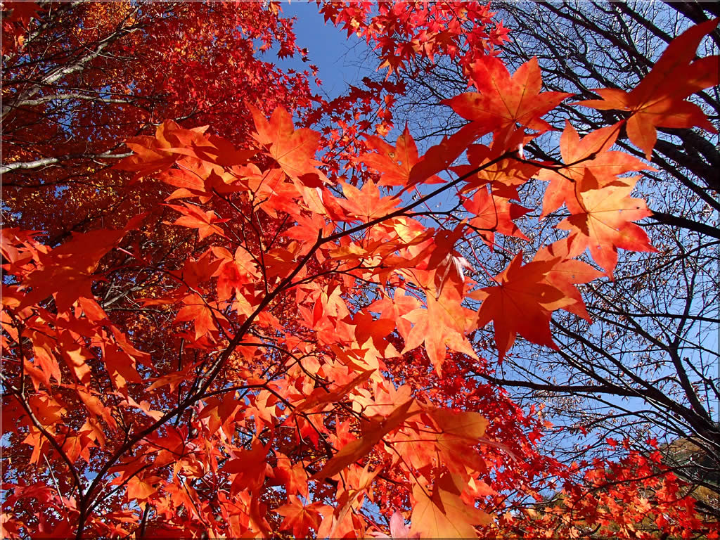 ふと上を見ると、風に紅葉が巻き上げられて大空に舞っていました。