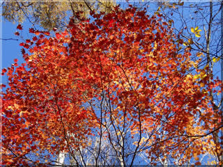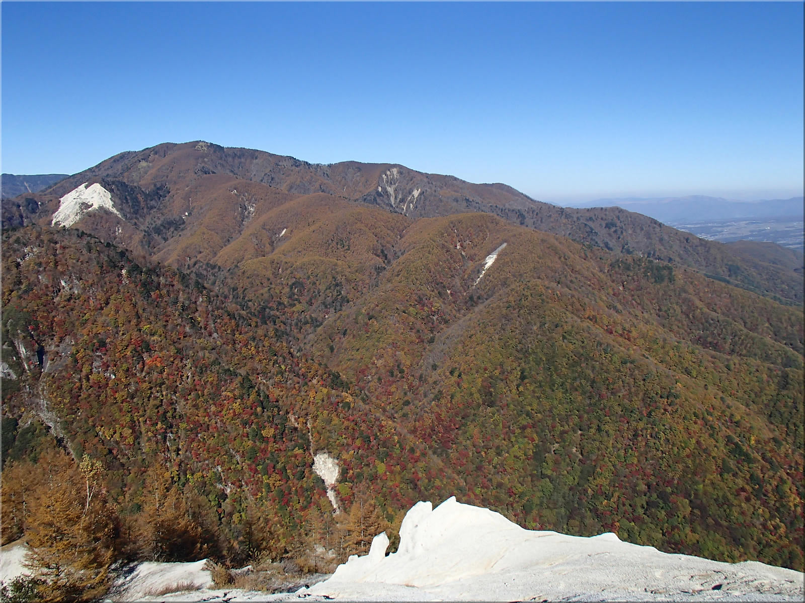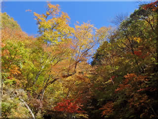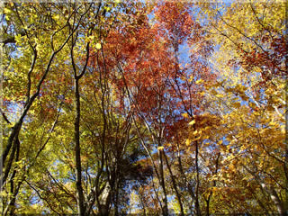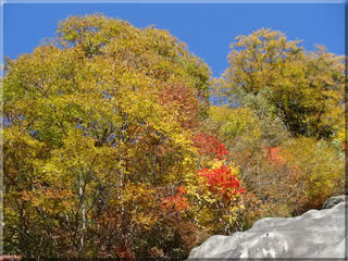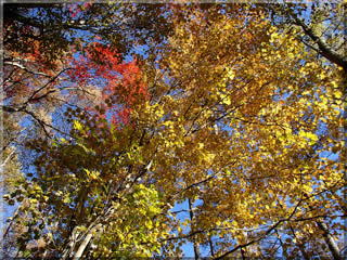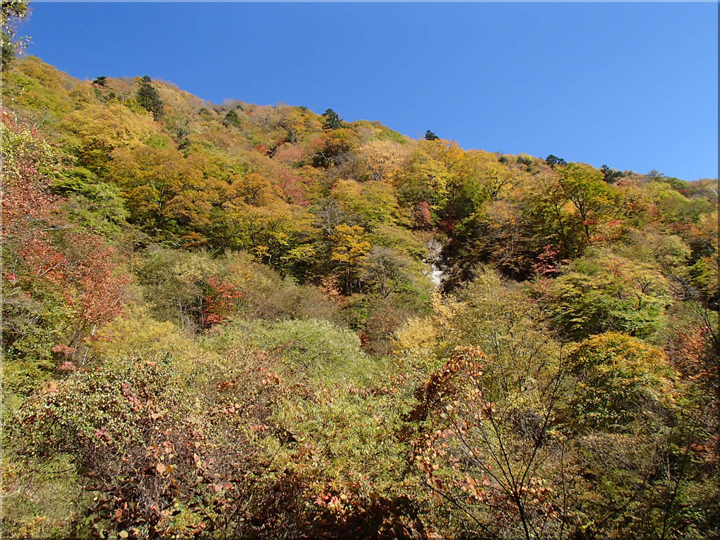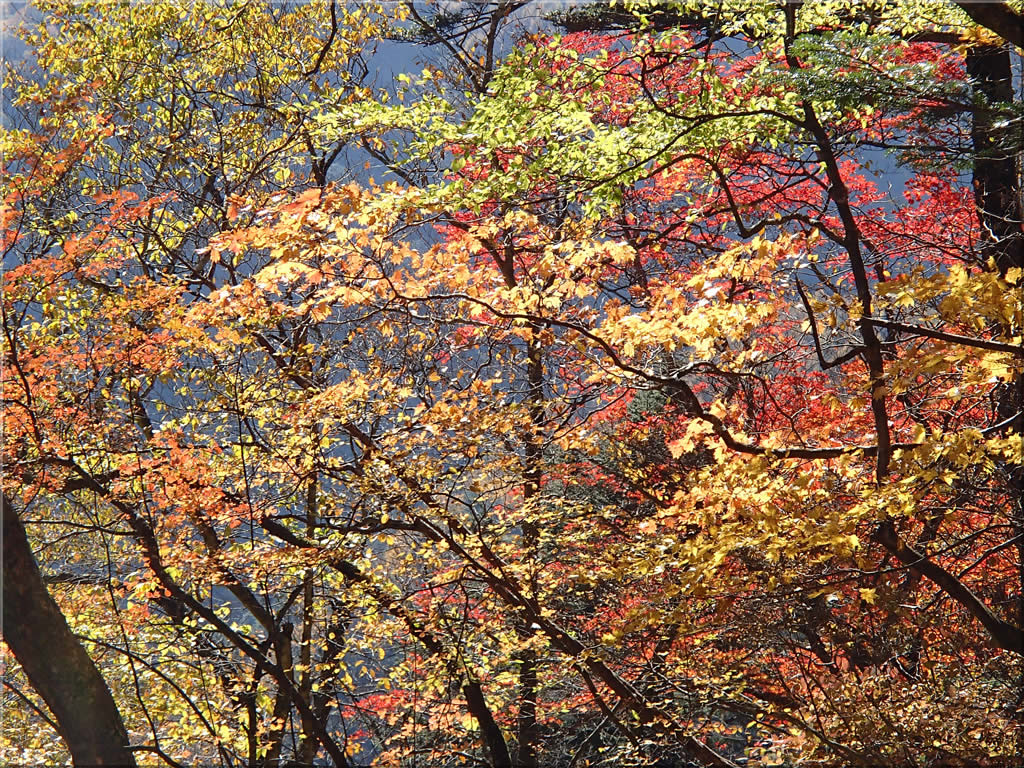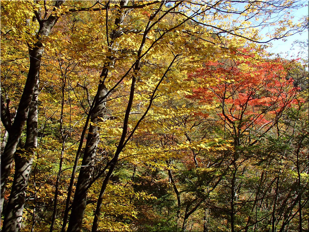 下り始めてすぐに登山道の周囲は鮮やかな紅葉であふれかえります(^^)。こちらのルートは常に広葉樹の森を進みますので、その意味では紅葉を楽しむには良いコースなのですが、ただいかんせん崖を下るかのような急な登山道で、滑ったら滑落必至のルートでもあります。登山口にも警告がありましたが、このルートを歩く場合は下りよりは登りで使った方が危険度が低いですし、また登りながら見上げる紅葉をたっぷりと楽しめると思います。(下っていると足下ばかり気にして、紅葉を楽しむ余裕がないというのも確かです)