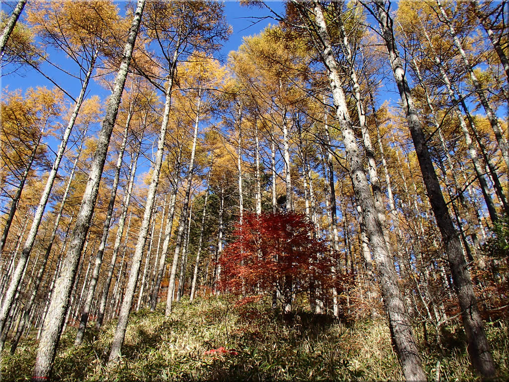 10-6の標識の辺りから周囲は一面のカラマツ林となります。そしてその中に紅葉が点在しています。