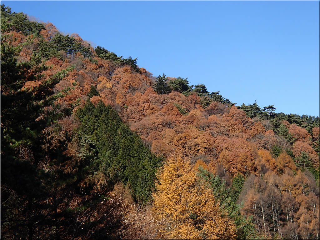 正面に見える斜面の紅葉をズーム。後半からそろそろ終盤という雰囲気です。