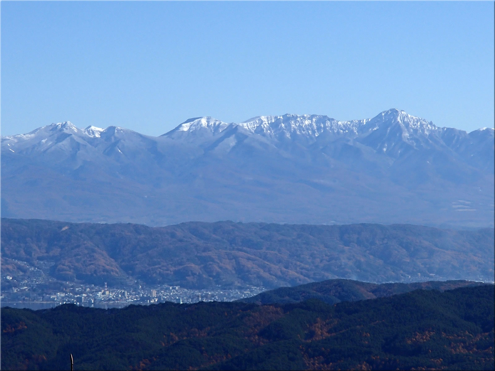 八ヶ岳赤岳〜天狗岳をズーム。手前には諏訪湖も少しだけ見えています。