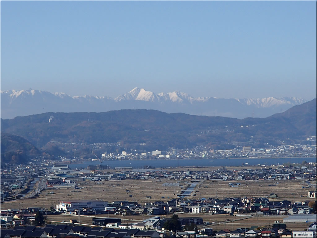 諏訪湖とその向こうに見える常念岳をズーム。