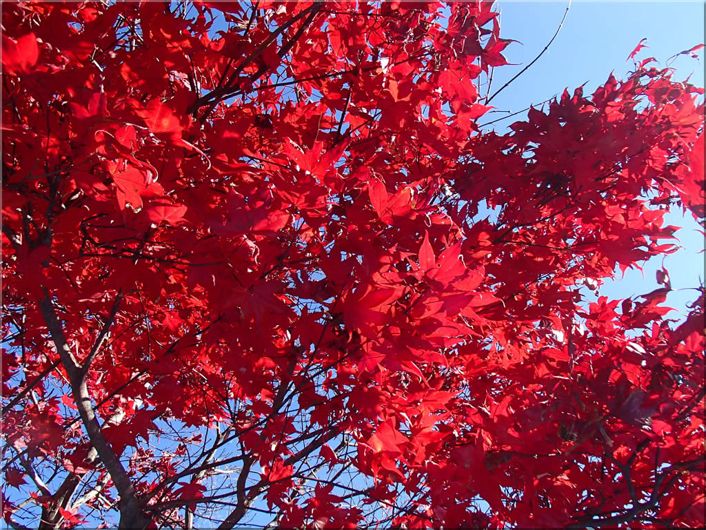 林道に出るところに深紅に色付くもみじが1本だけあります。