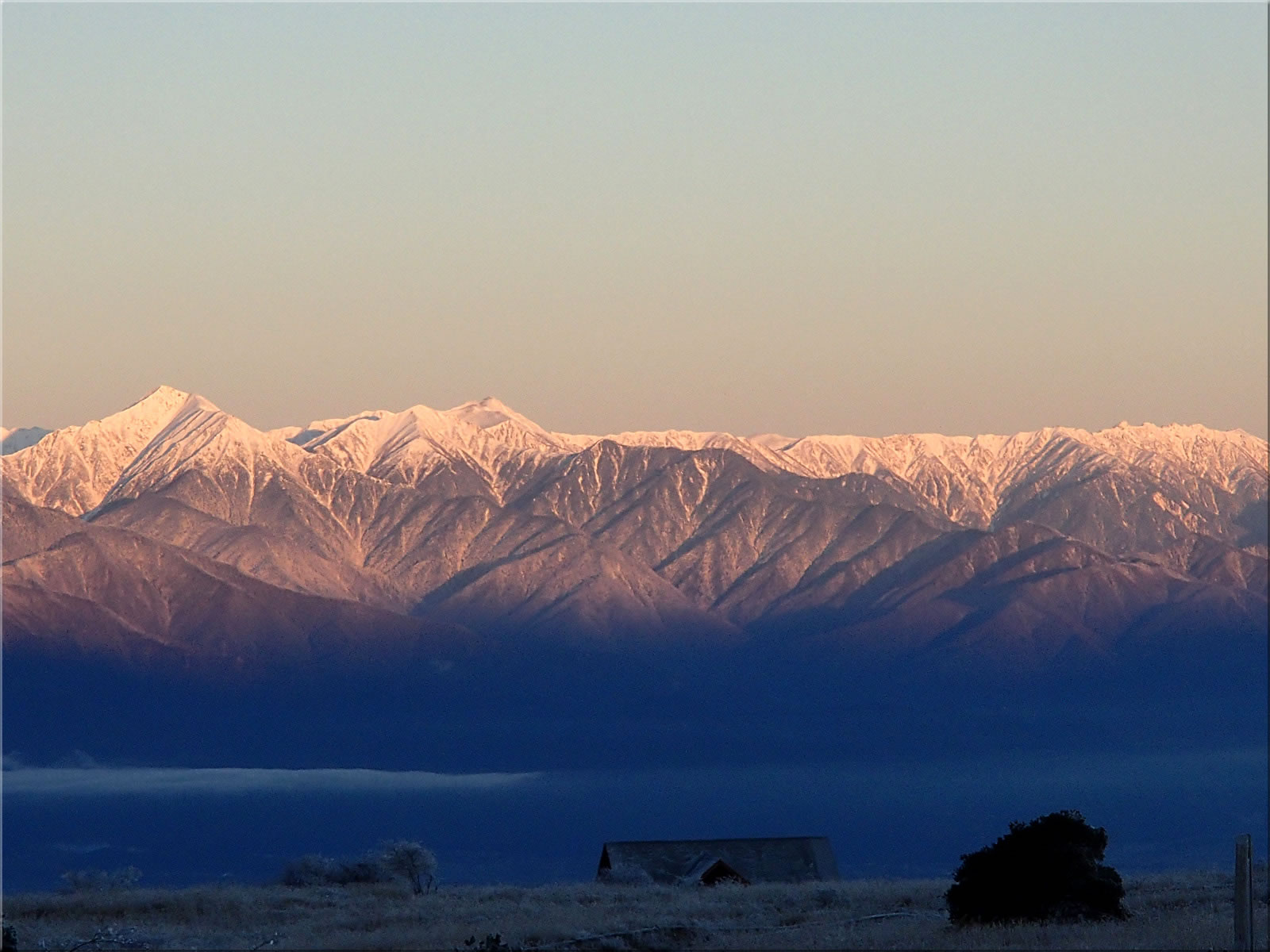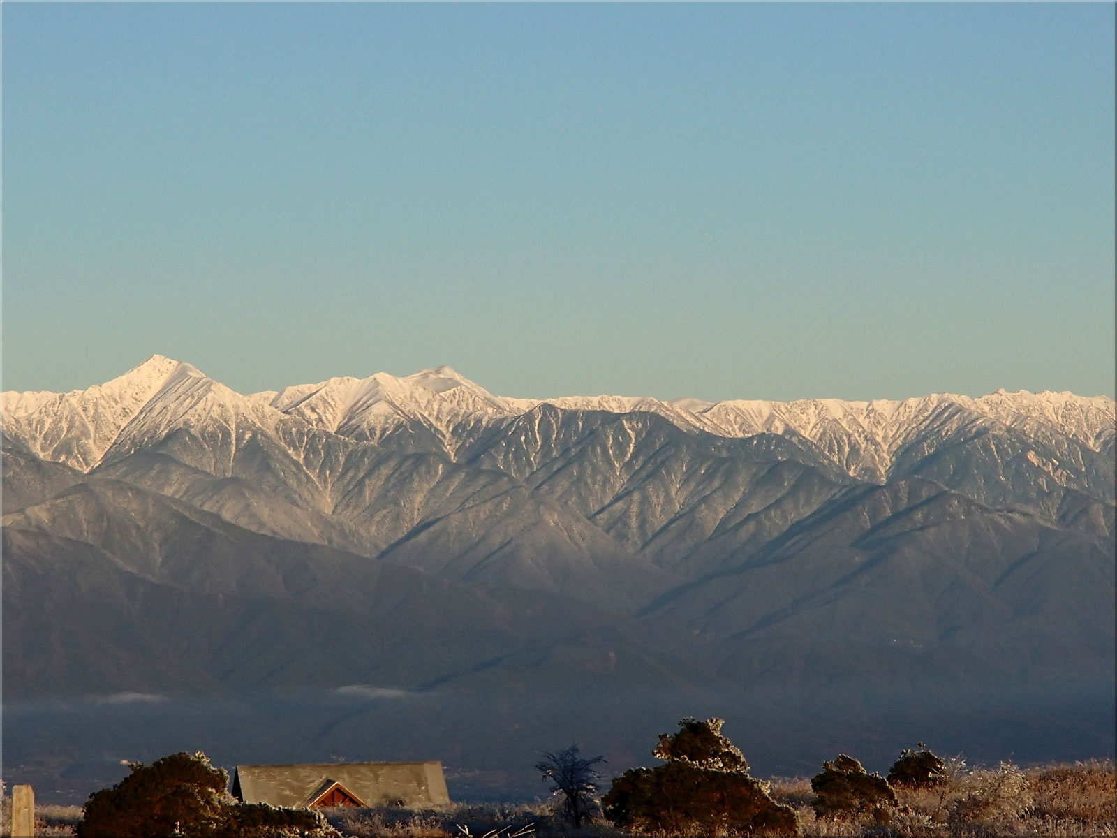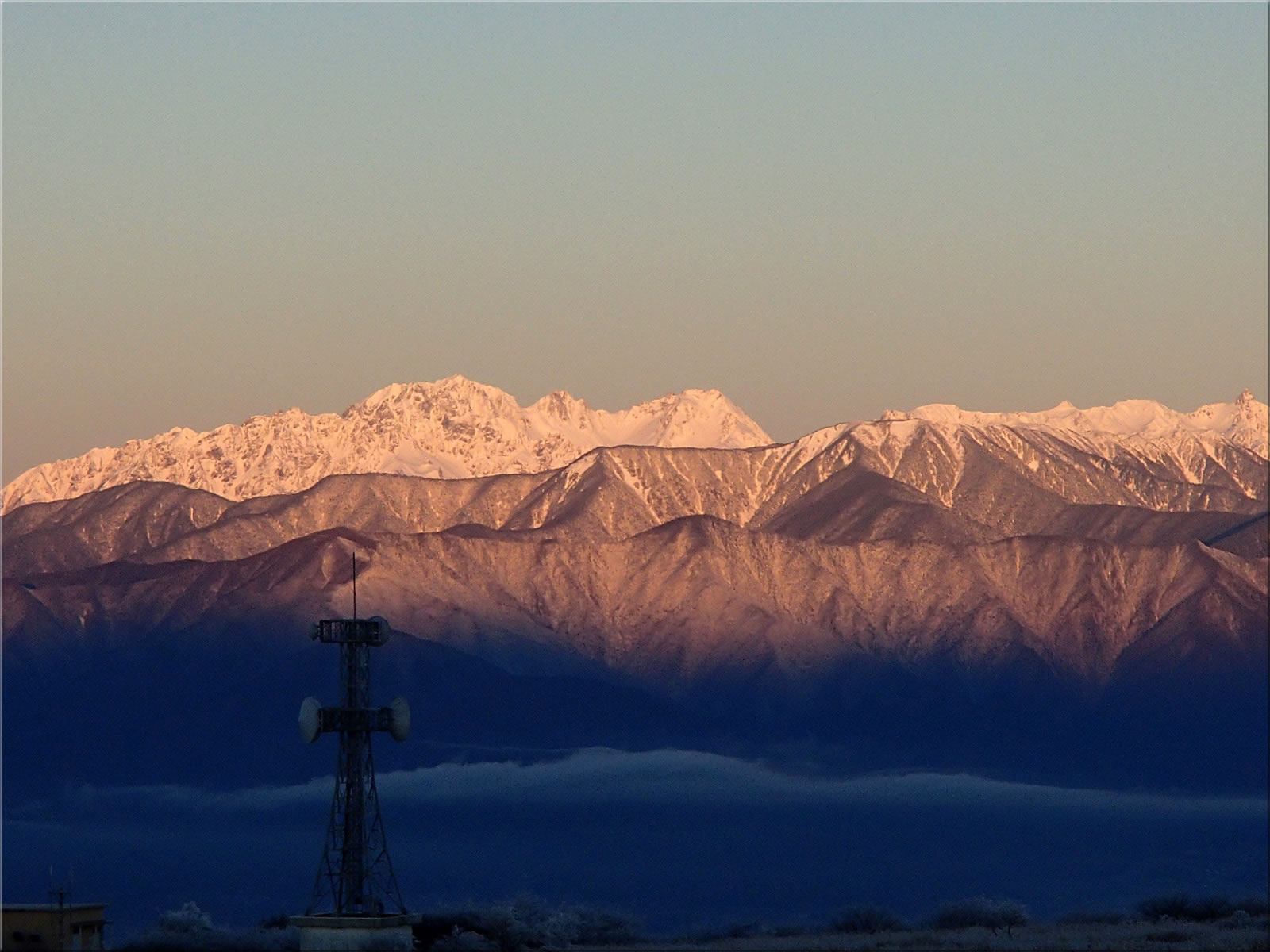 北アルプス槍穂高をズーム。おそらく八ヶ岳が邪魔してまだこの辺りには日射しが届かないようです。