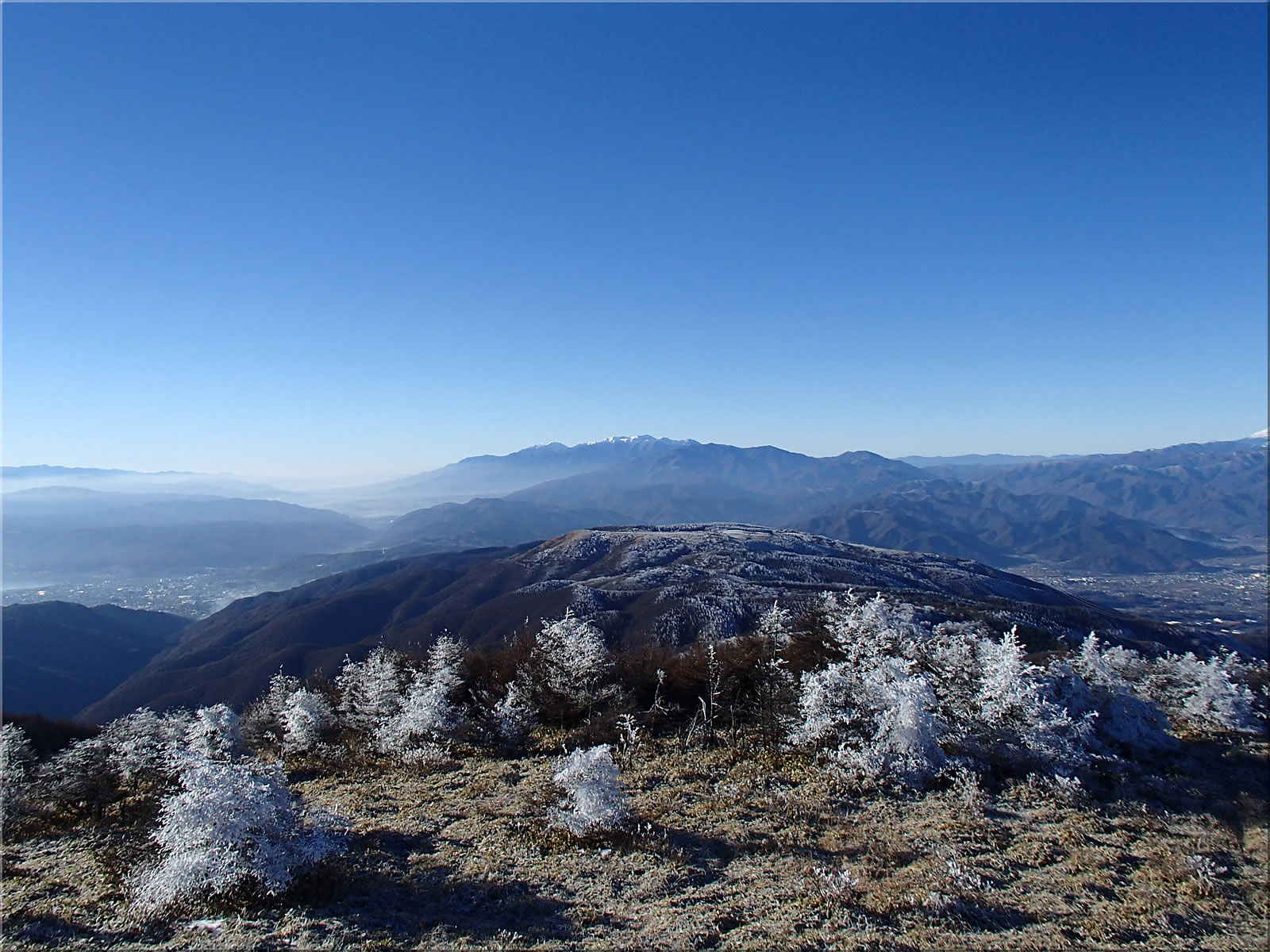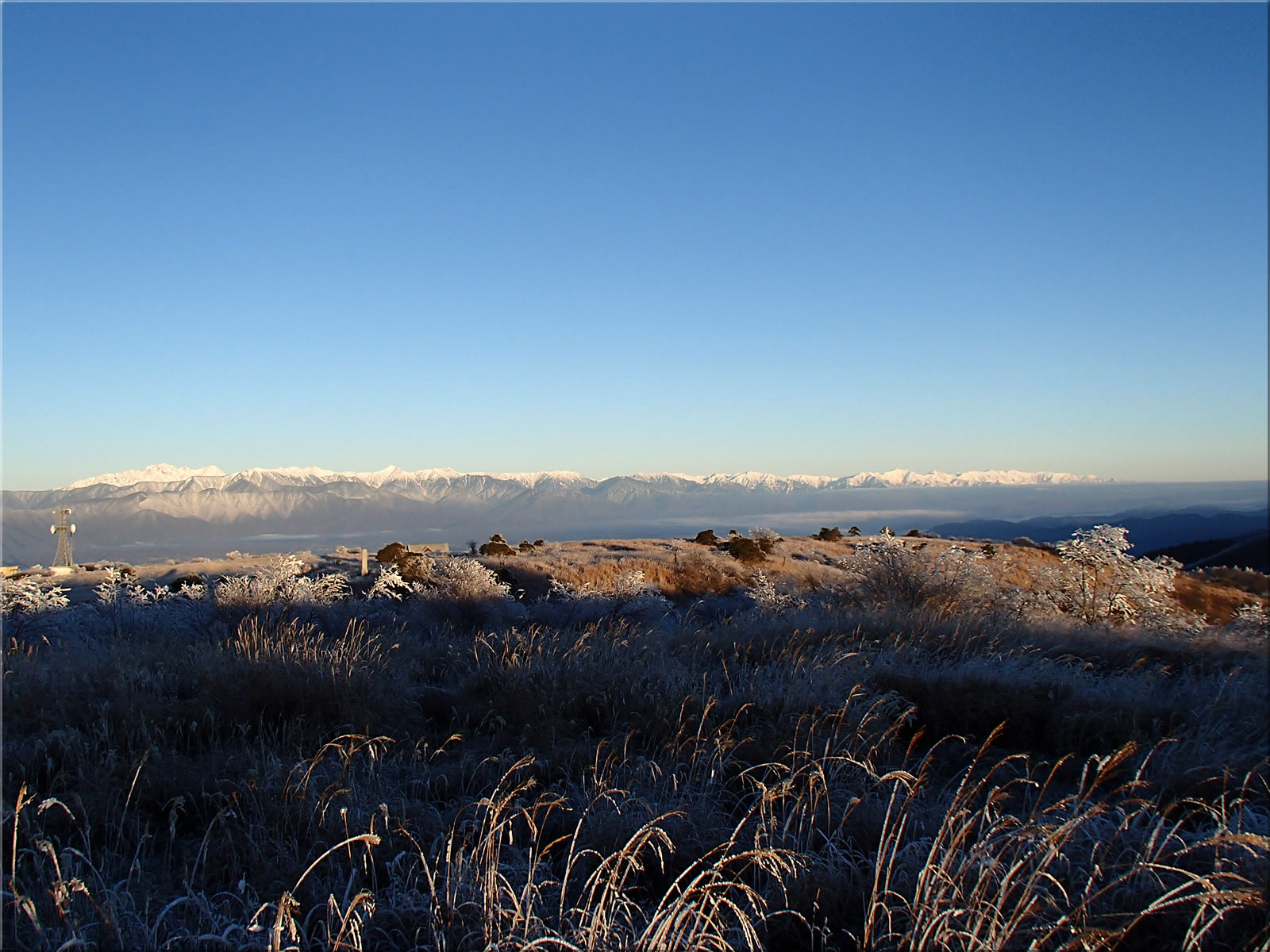 では駐車場に引き返し、次の目的地である鉢伏山に向かいます。戻る途中、周りの一面のススキが霜か霧氷で真っ白になっていて、とてもきれいでした。