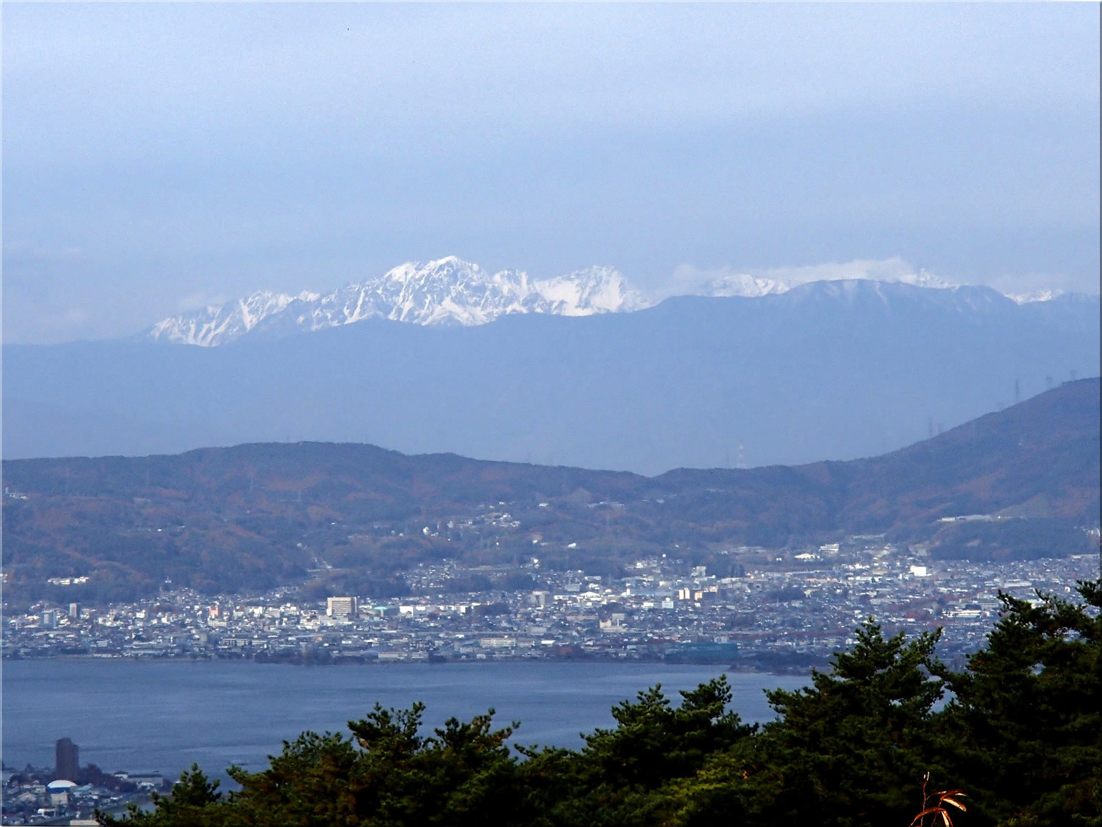 諏訪湖とその向こうに見える北アルプス槍穂高をズーム。ちょっとかすんでしまっています。