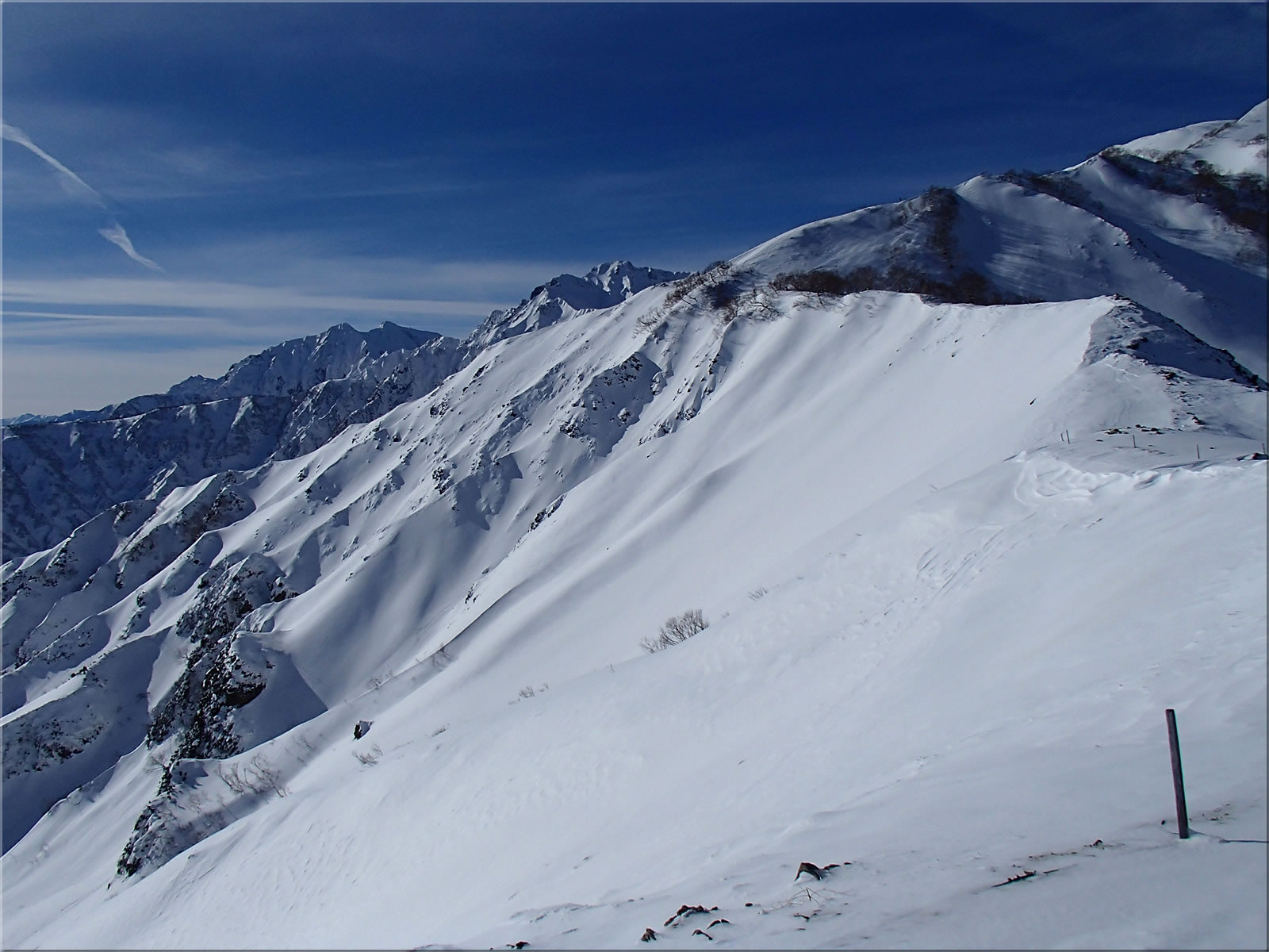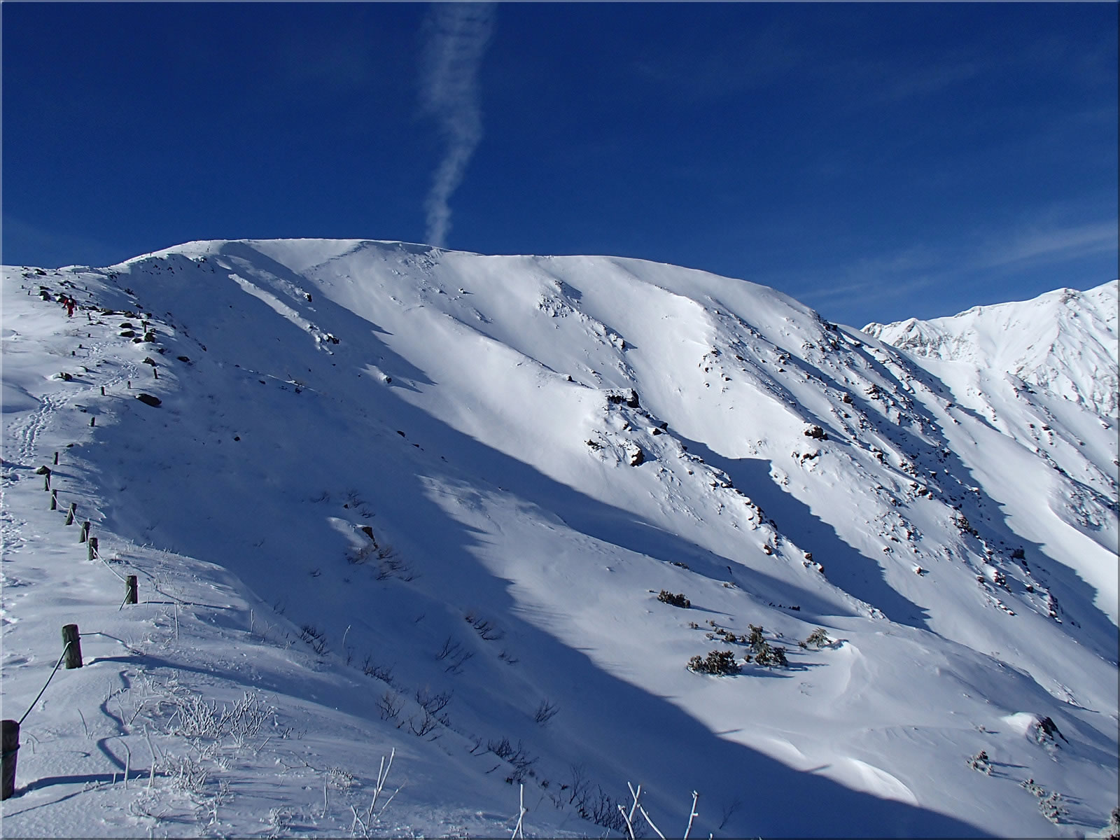 稜線に出ると、新雪は吹き飛ばされてカリカリになっている部分が多くなりました。