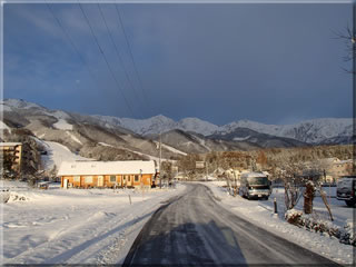 次の写真は八方尾根スキー場の近くから撮影したスキー場の様子。里では雪がまだ少なく、10cmか15cmという感じでした。