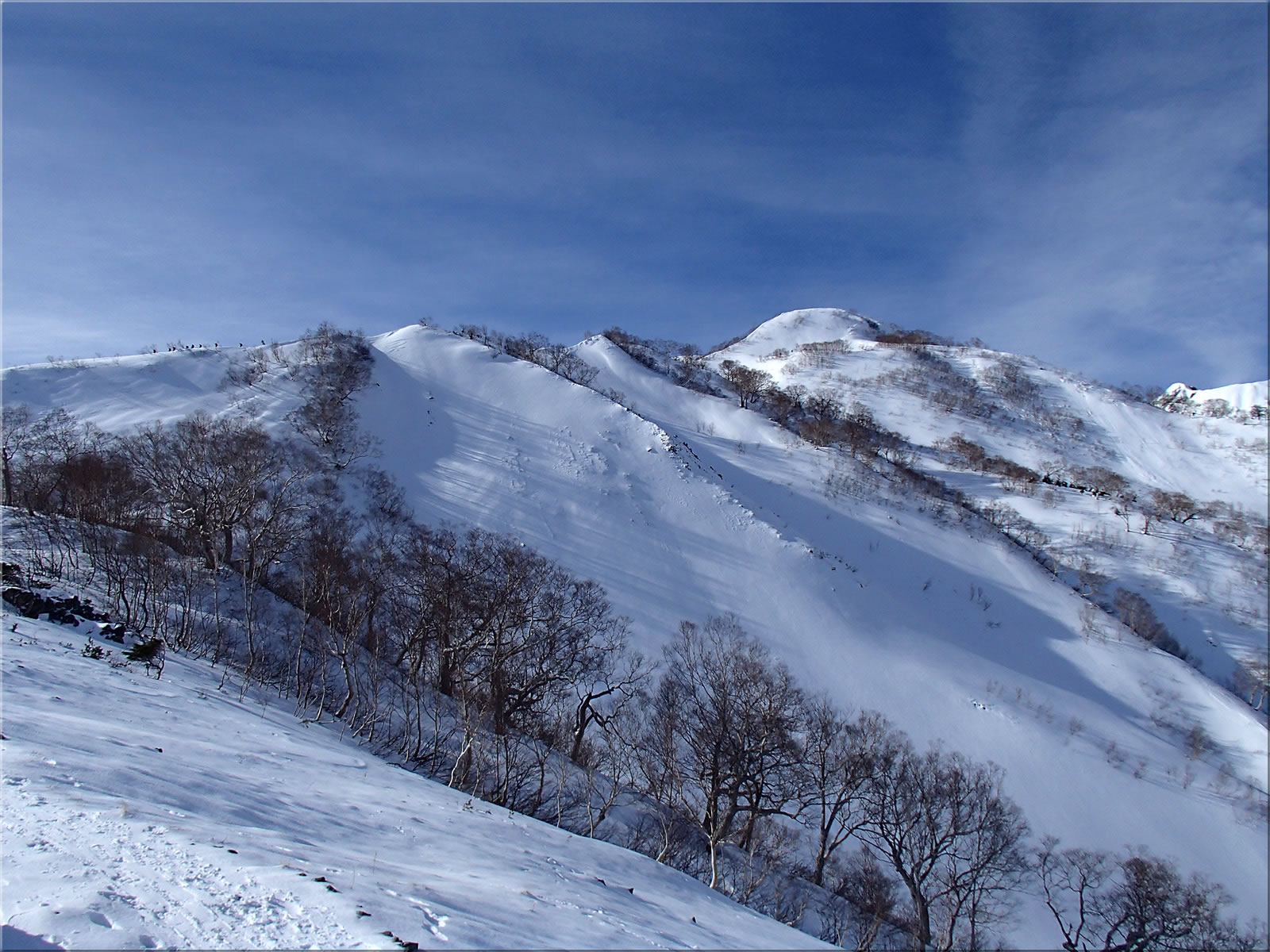 11時50分、やっと稜線までたどり着きましたが、今シーズン最初ということで、この時点でもう足はぱんぱんでした。先ほど滑った斜面を見ると、沢山のシュプールが刻まれていました。ここはゲレンデかと思うほどです。