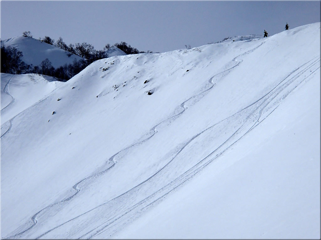 斜面のあちこちから滑り降りる人が増え、斜面に刻まれたシュプールがだんだんと増えてきました。さてどんどん滑り降りていきましょう。