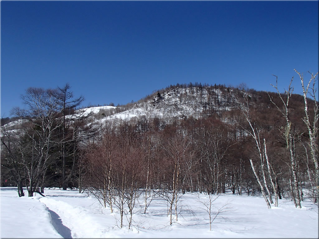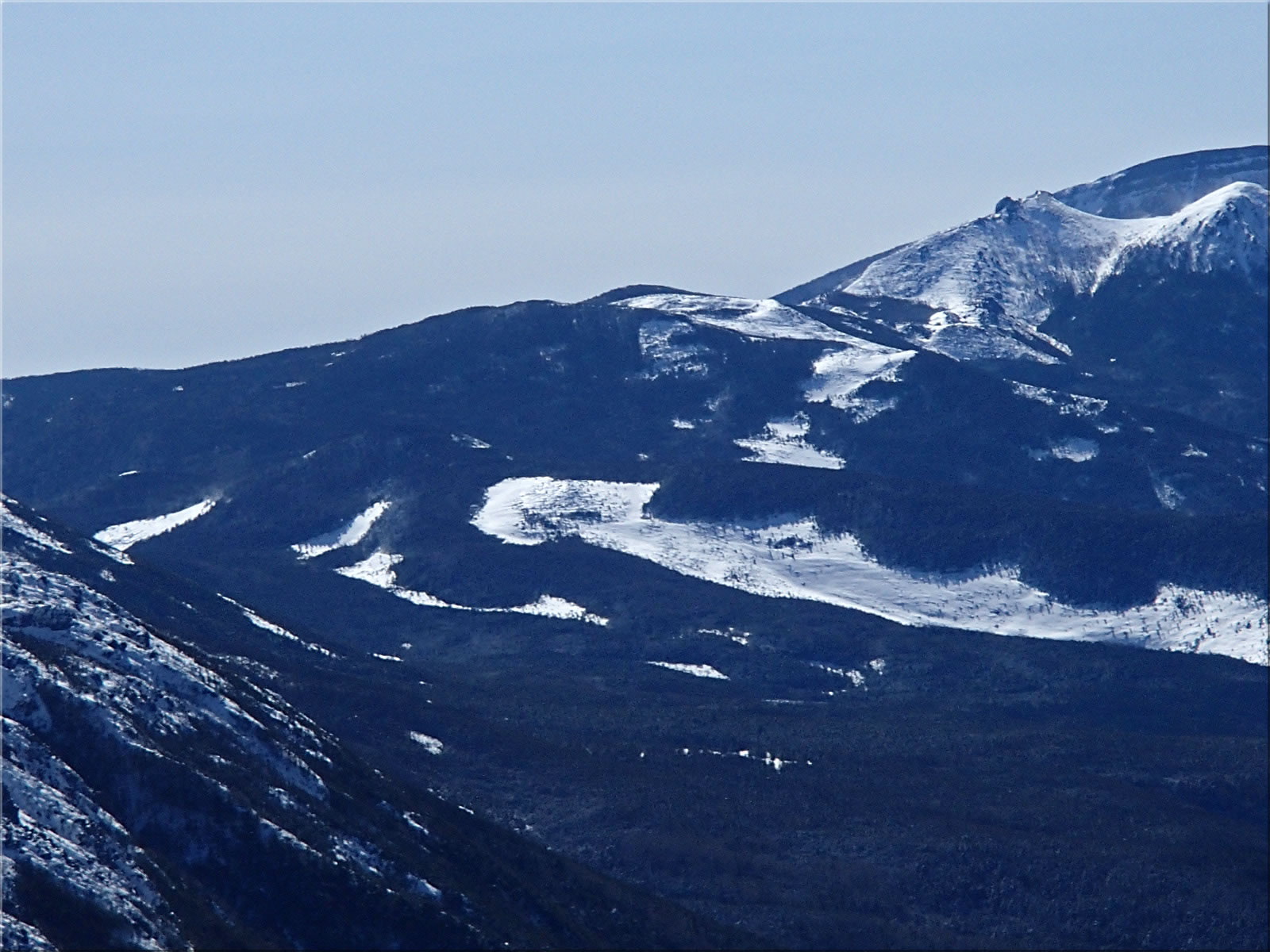 天狗岳をズーム。丸山のいくつかのオープンバーンが見えます。