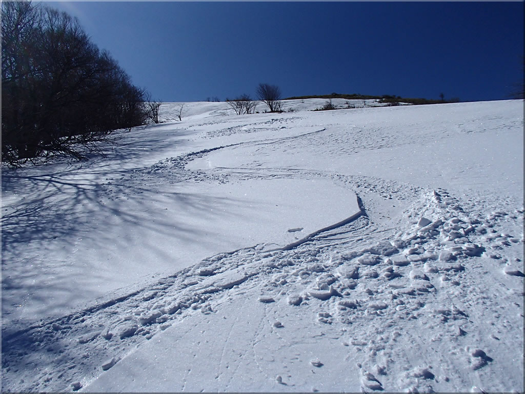 この辺りの積雪量は2週間前とほとんど変わっていないように見えます。かちかちだったらいやだなとおそるおそる進むと、表面には5cmほどの柔らかい新雪が積もっていました。