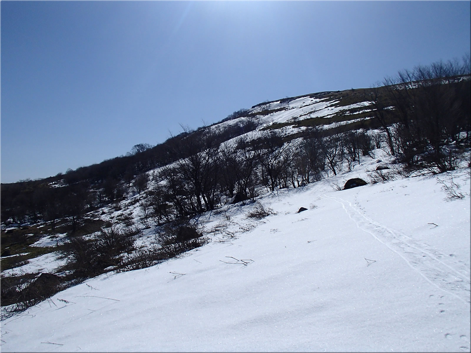 山頂直下の急斜面は下の方は雪が無く登山道が離れているため、出来るだけ西側まで行って登山道まで降りられるようにしたいと思いますが、果たしてどうなりますことやら。