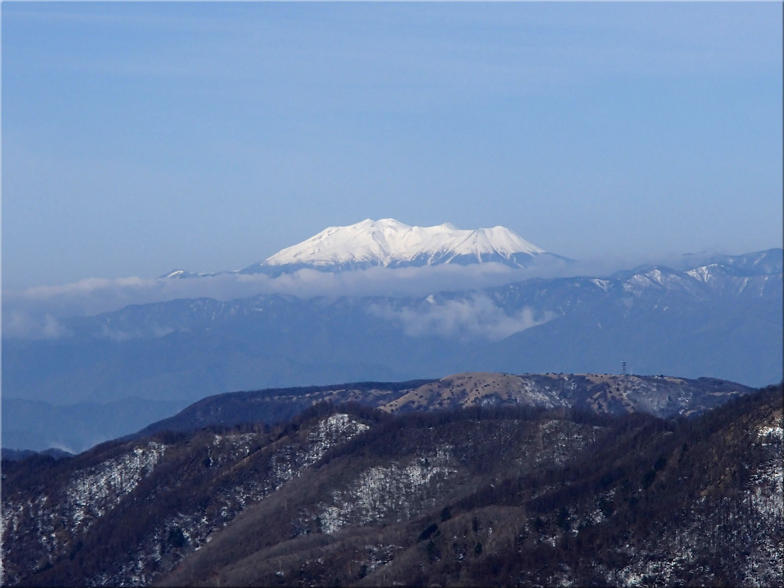 御嶽山をズーム。真っ白です。滑るラインをいろいろ考えながら眺めていました(^^)。