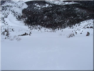 東天狗岳北面にも20から30cmほどの柔らかい雪が積もっていて、ラッセルがきつかったです。途中で両足が痙攣し(^^;、この辺りから滑ることにします。