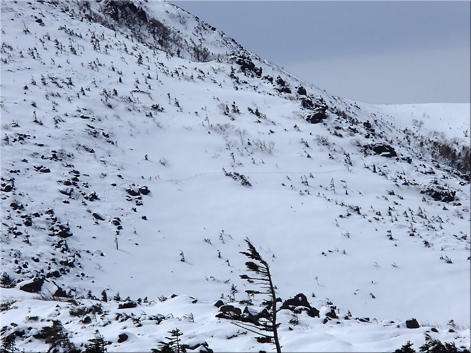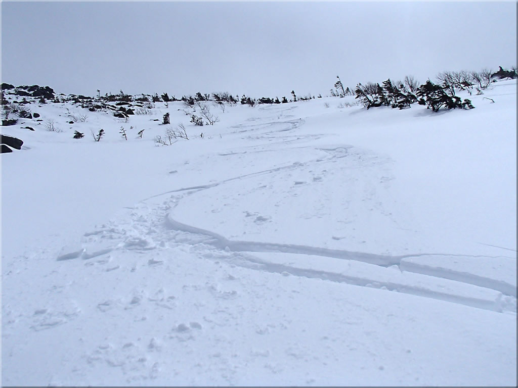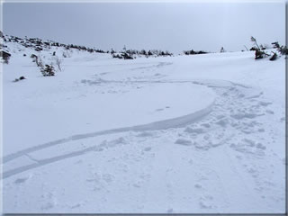 東天狗岳北面をズーム。私のシュプールもよく見えています(^^)。ちなみに厳冬期の降雪直後だとこの斜面は気持ち良いパウダーバーンになるのです。