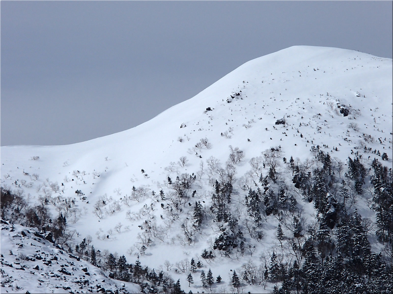 後で滑る西天狗岳の斜面の様子。滑るには問題ない雪の量です。あとは雪質です。