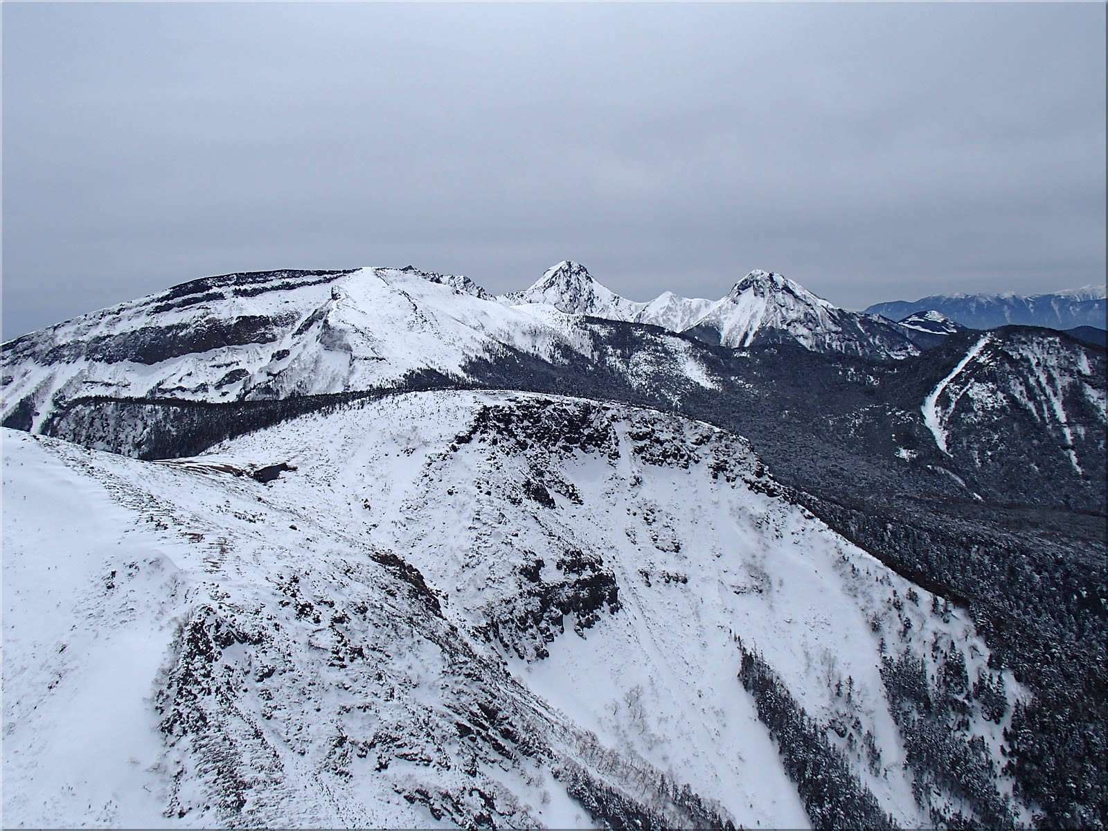 高曇りで青空はありませんが、周囲の山は皆きれいに見えていました。では今日の展望を南八方面から右回りでご紹介。