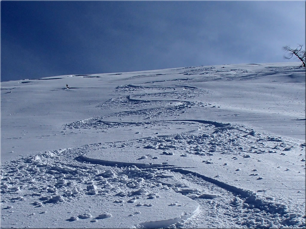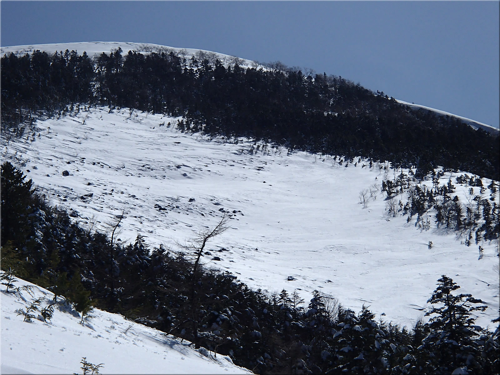 この先は登山道に戻り登山道近辺を滑り降りていきますが、登山道脇の斜面も上半分は積雪も多く、広い斜面では気持ちよく滑り降りることができました。