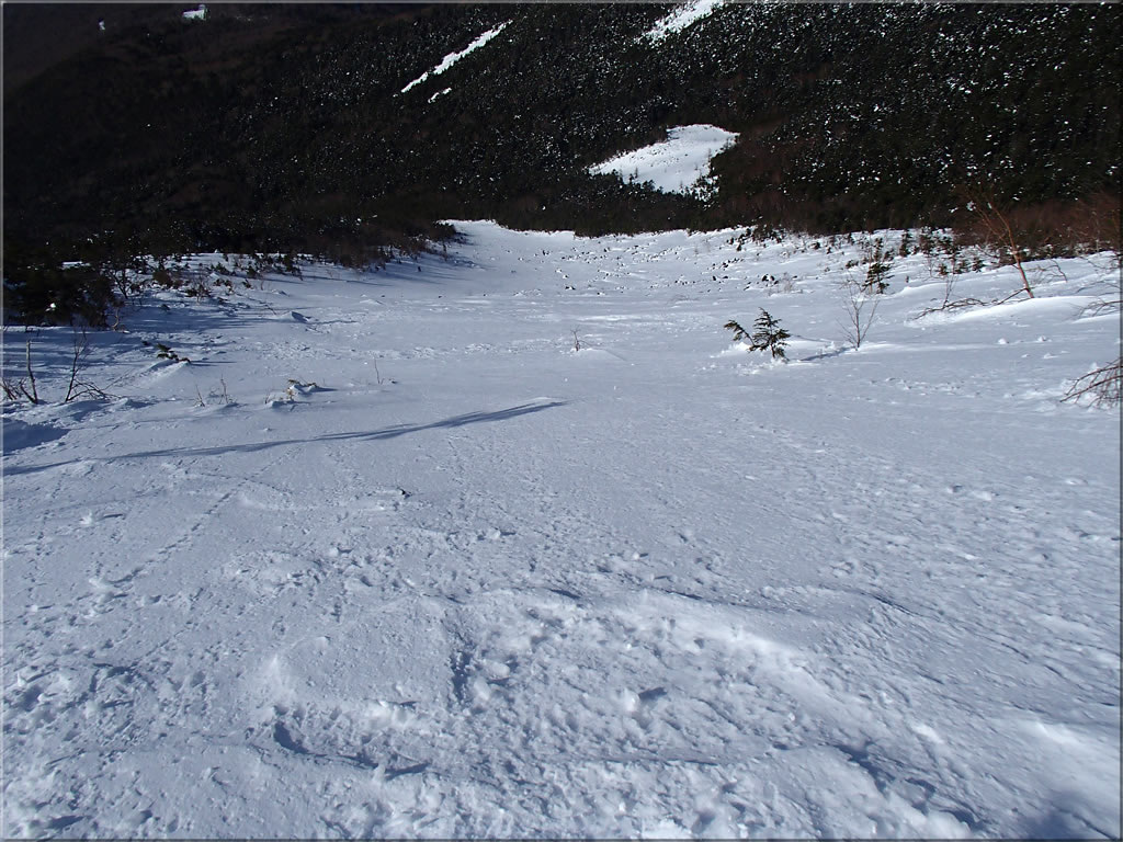 いつもだとこのオープンバーンを一番下まで滑ってから少し登り返して登山道側に戻るのですが、今回は時間が遅いので、途中から登山道側にトラバースしていきます。
