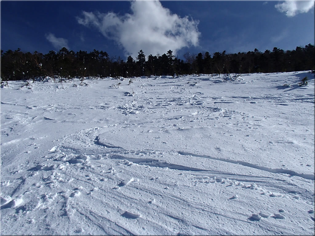 このあたりで新雪は30cmを越えています。坪足だと膝近くまで潜ったのではないでしょうか。たださらさらパウダーではないので、スキーだと10cmほどしか沈まず、まあまあ快調に歩くことができました。