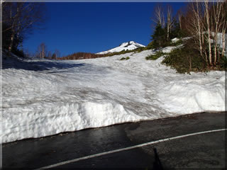 ゲレンデも陽当たりの良い部分は雪解けが進んでいますが、それでも道路で寸断されている部分を除けば駐車場まで問題なく滑って下りられそうです。