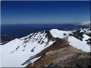 剣ヶ峰をズーム。山頂直下の岩場コースもまだ雪が問題なくつながっていますので、今回はそちらのコースを滑り降りてみます。蚕玉岳側の大斜面は6月まで問題なく滑れるでしょうし。