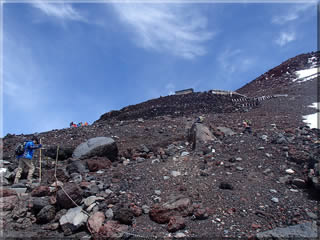 新七合目の小屋が見えてくると、やっと少し空が青くなってきました(^^)。