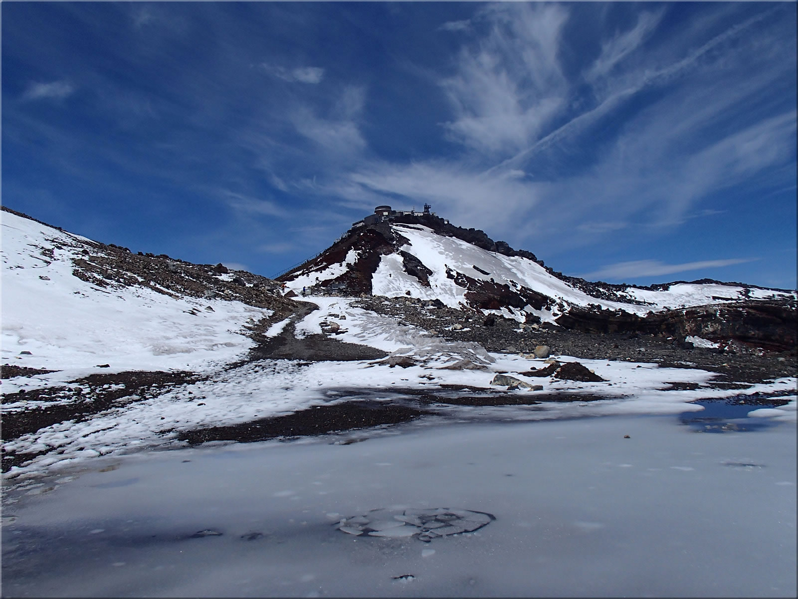 次の3枚は富士山山頂の様子。周囲は雲海で展望はあまりありませんが、でも青空が気持ちよいです(^^)。