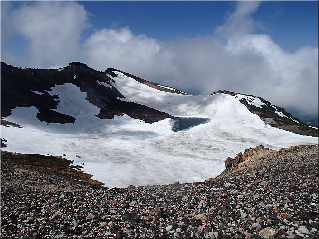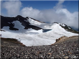 当初は剣ヶ峰と蚕玉岳の間の広い斜面を滑り降りようと思っていたのですが、山頂まで板を背負ってきてしまいましたので、それならばと今回も山頂直下の狭い雪渓を下ってみることにしてみました。途中雪が途切れている部分がありますが、少し歩けばなんとかなるかなと思って下ったのですが、雪のある部分も残雪の幅が狭く、もう賞味期限切れという感じでした(^^;。