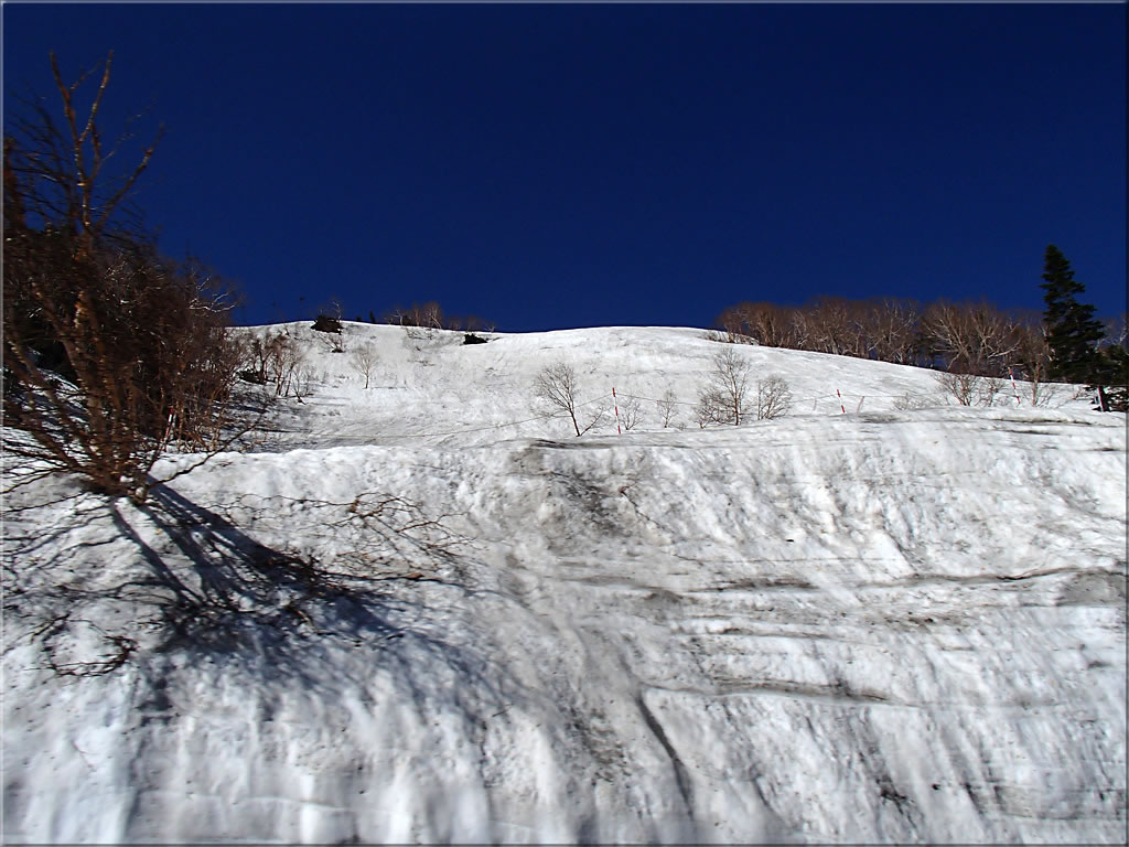 山頂直下のルートをズーム。今回は途中少し歩いて何とか滑り降りれましたが、今後はもう滑走不可と思った方が良いと思います。