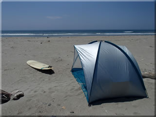 ウェットスーツに着替え、日よけ用テントとボードを持ってビーチに向かいます。