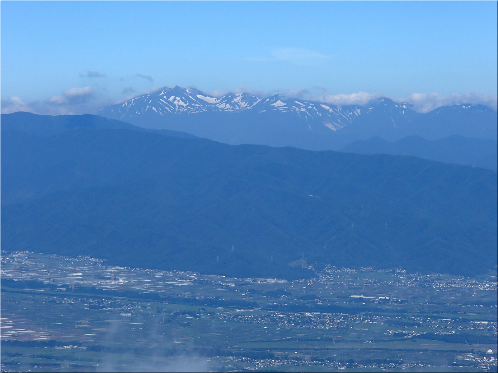 後ろを振り返ります。遠くに県北部の頸城山塊の山も見えています。ただこの辺りから県北部にかけてある上空の雲が邪魔です(^^;。