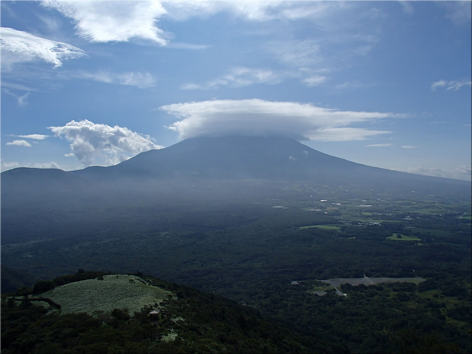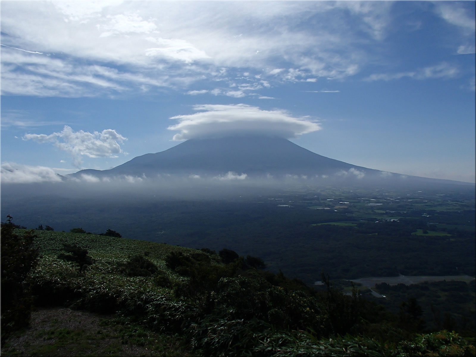 山頂にはガスが次々とかかり、時々青空が見えるものの富士山をここから眺めることは出来ませんでした。ただし吹く風は涼しく、汗で濡れた服では少し寒いほどでした。