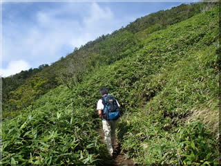 斜面をほぼ登り切ったあたりは登山道が見えなくなるほどに笹に覆われていました。この時間は朝露がそれほど無かったので良かったのですが、もっと時間が早いとカッパを着た方が良いかもしれません。