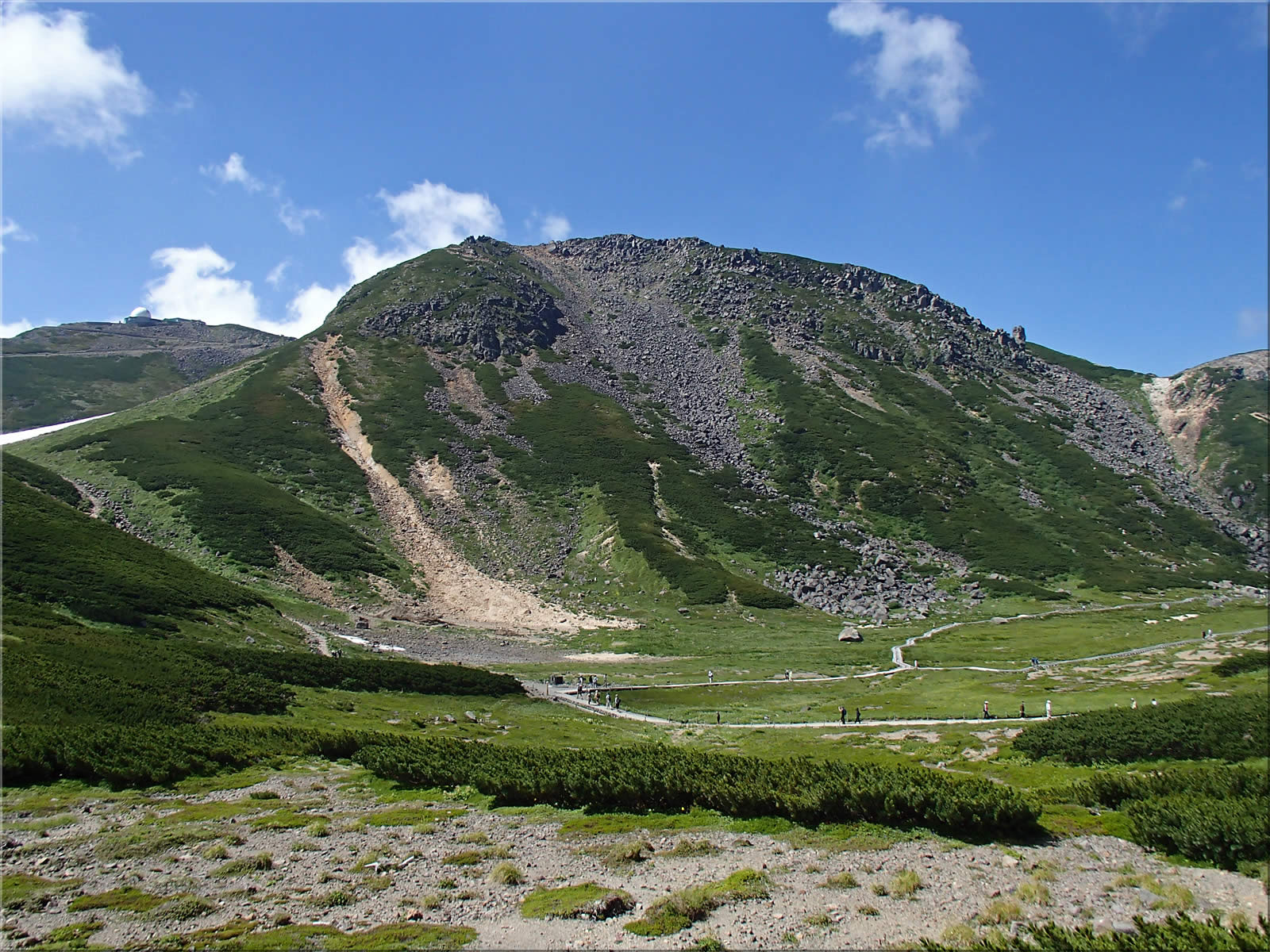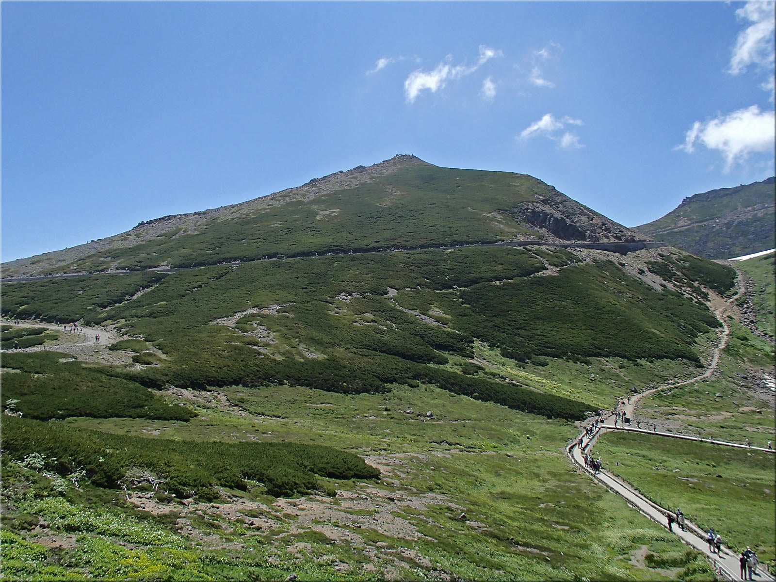 位ヶ原に着くと目指す乗鞍岳が正面に見えてきました。緑と青と白のコントラストが強烈で、まさにTHE 夏山という感じです。