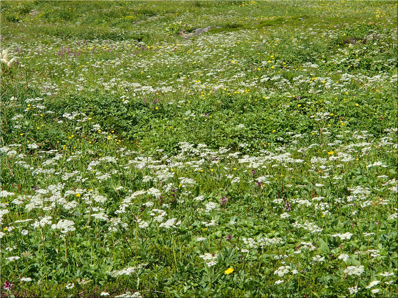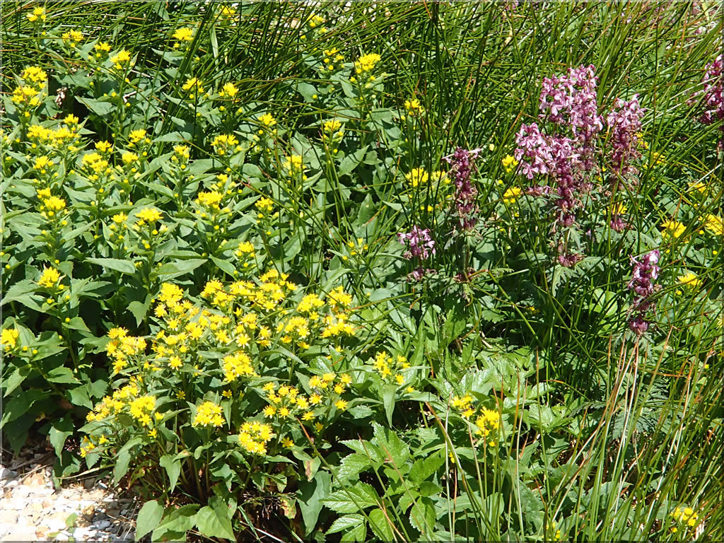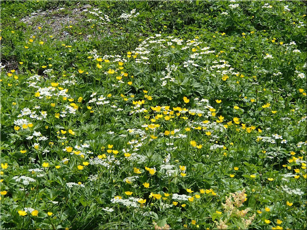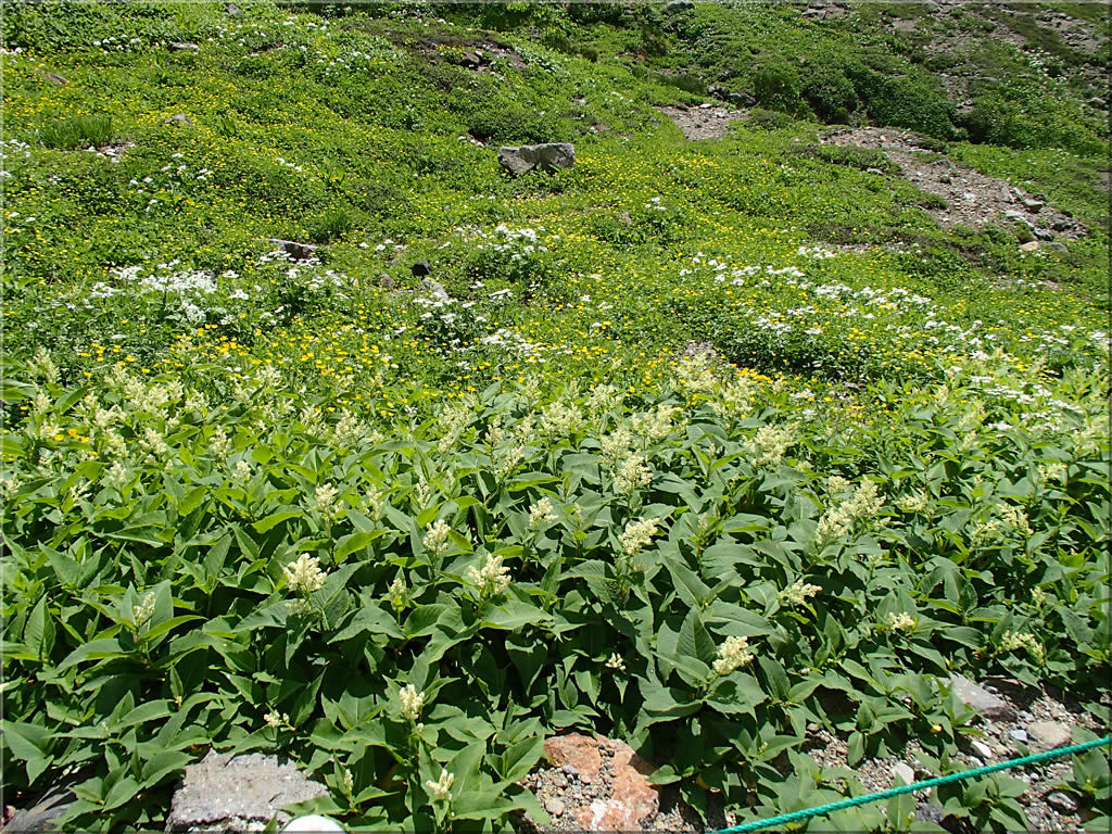 途中通るかもしかゲレンデの斜面も見事なお花畑になっていました。ピンクの目立つ群生はヤナギランでしょうか。