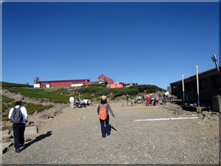 やっと正面に肩の小屋の建物が見えてきました。この辺りは風がほとんど無く、強い日射しで暑さを感じました。