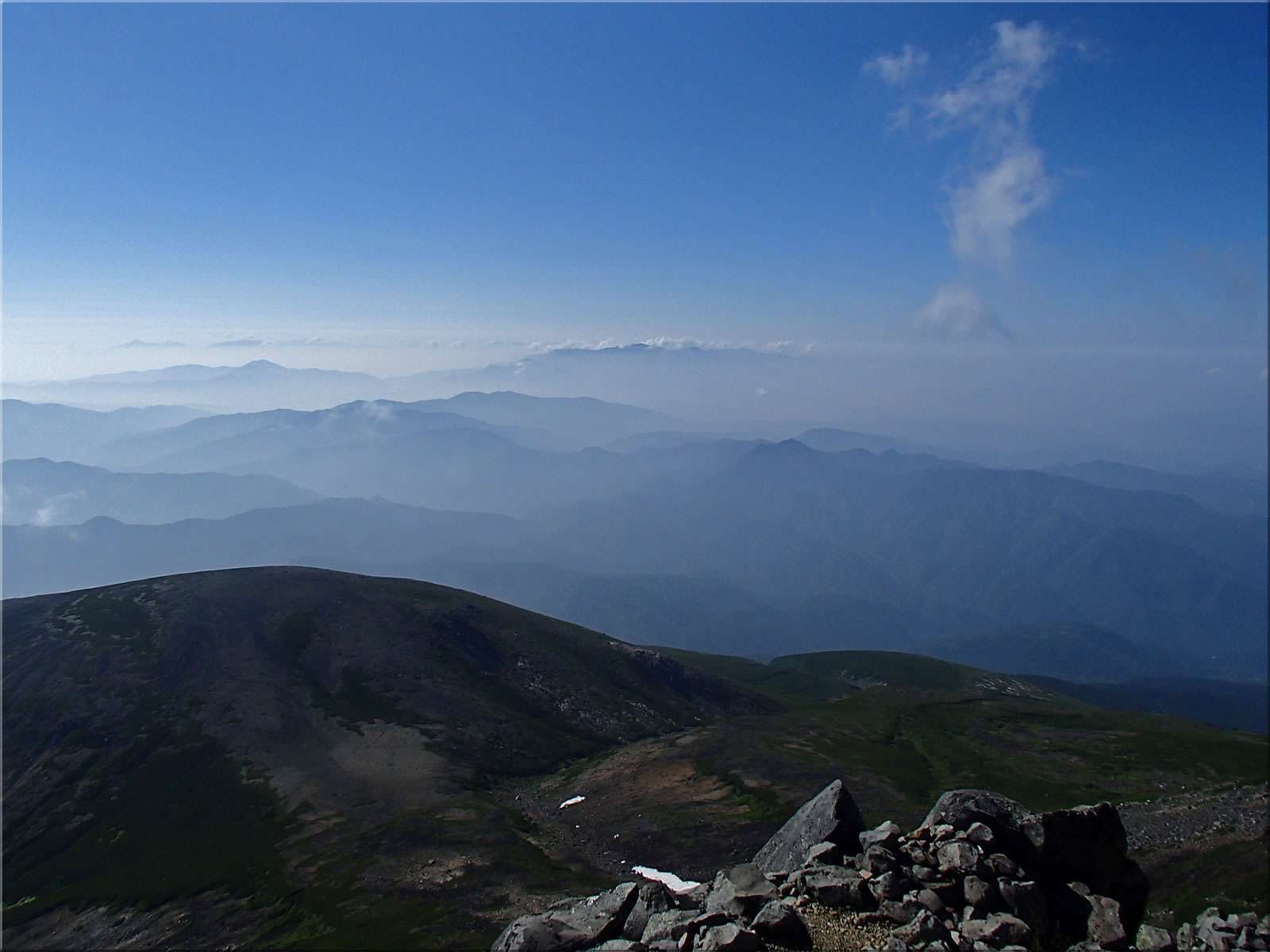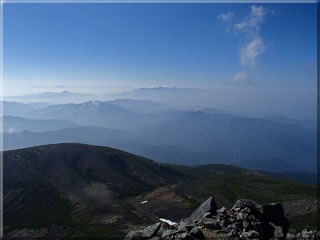 この猛暑で遠くはかすみ気味ですが、なんとか槍穂高あたりまでは見えています。では今日の展望を北アルプス方面から右回りでご紹介。