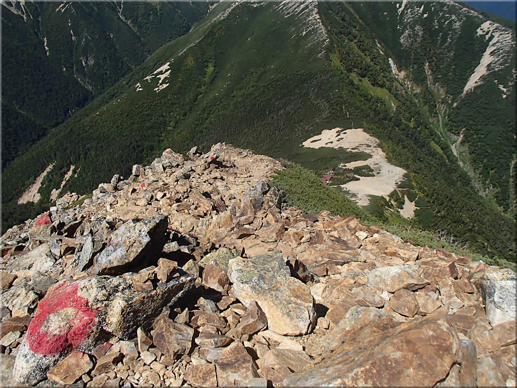 斜面を向こう側に少しくだった所に常念小屋があります。