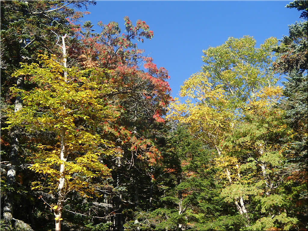 石室山荘を下った辺りで急にガスが切れ、隣の斜面が見えてきました。この辺りもちょうどピークの色付きという感じです。