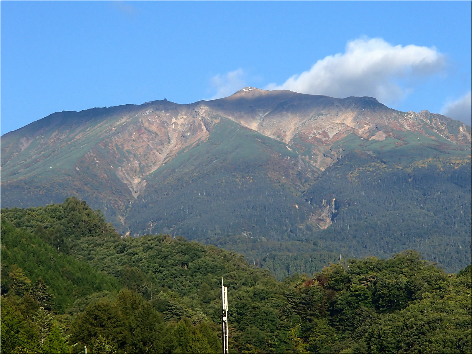 次の写真は六合目に向かう途中で撮影した御嶽山の様子です。山頂に少しガスがかかっていますが、まあ時間と共に無くなるでしょうと楽観視していましたが、結局ガスはその後どんどんと湧いてきてしまいました(^^;。