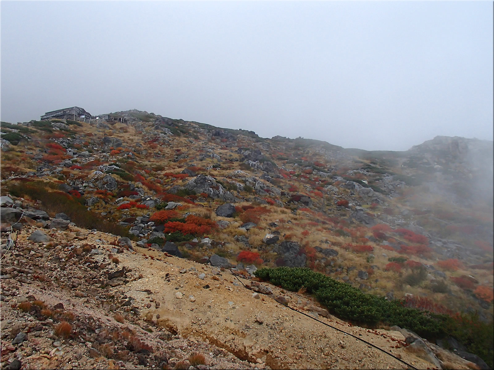 天気は朝は快晴でしたが9時を過ぎた頃から一気にガスってきてしまったのが残念でしたが、でも9合目から8合目にかけての紅葉がピークを迎えていて、一面のカラフルな紅葉はとてもきれいでした。