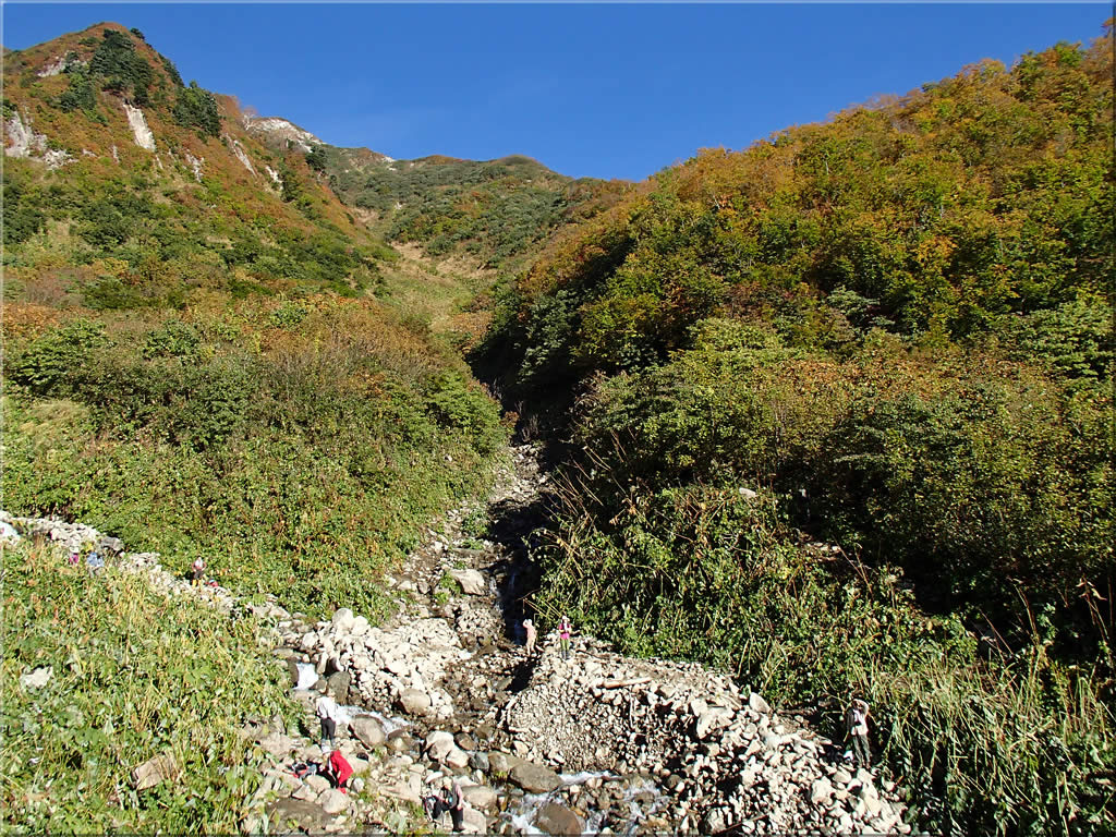 そして荒菅沢を見下ろすビューポイントに到着。やはり斜面の下の方はまだ緑が多く、見頃は斜面の真ん中から上という感じです。