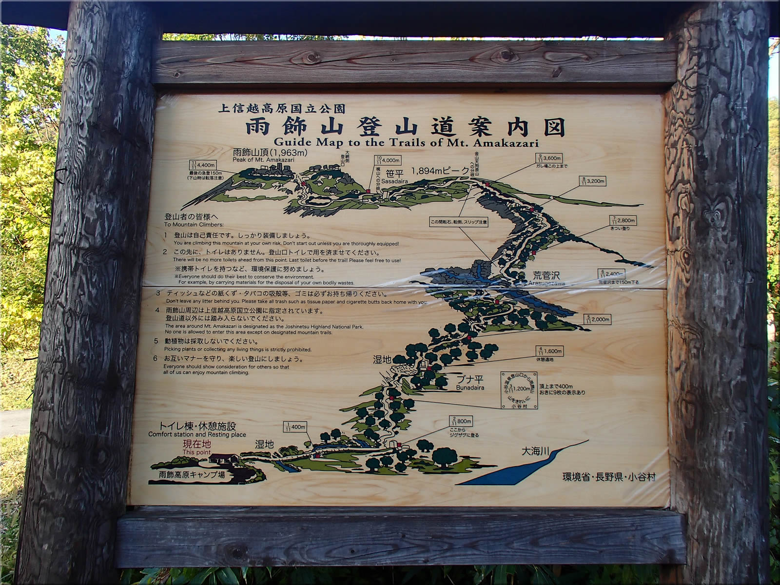 自宅を4時20分に出発し、雨飾高原キャンプ場を目指します。そして6時44分、キャンプ場の駐車場に到着。平日ながらすでに一番上の駐車場は一杯でしたので(まあ真ん中の列はまだ空いていましたがちょっと狭いので)、20mほど下った路肩の広いところに駐車しました。