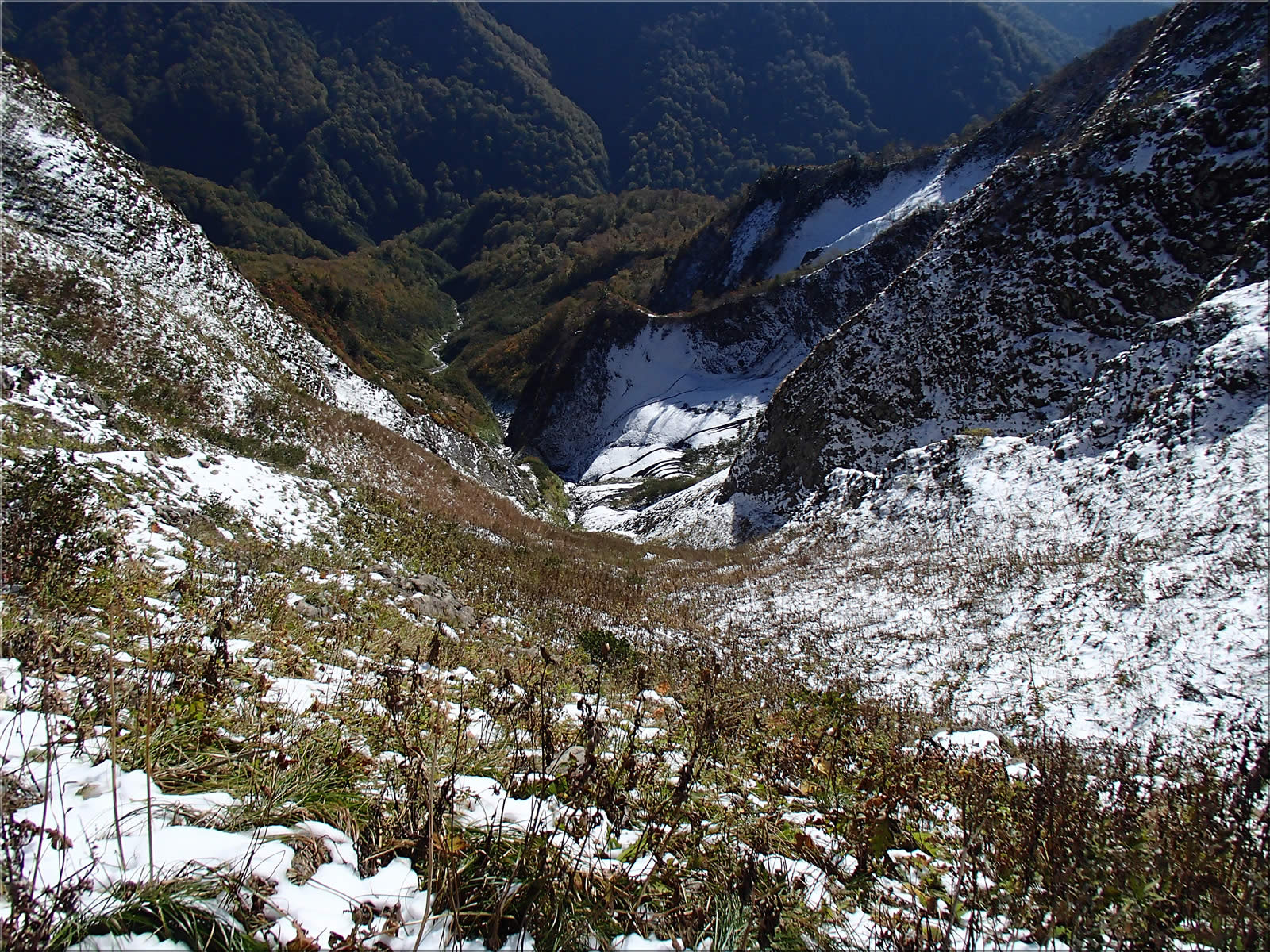 ここまでは登山道脇がうっすら白くなっている程度でしたが、荒菅沢に向けて下り始めると、急に積雪が多くなりびっくりしました。かちかちではないので、注意して歩けばなんとかなる程度ですが。