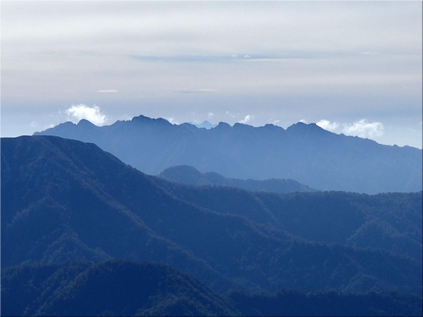 戸隠連峰をズーム。ちょうど真ん中当たりに遥かに見える三角形の山が気になります。蓼科山あたりかなあ?。