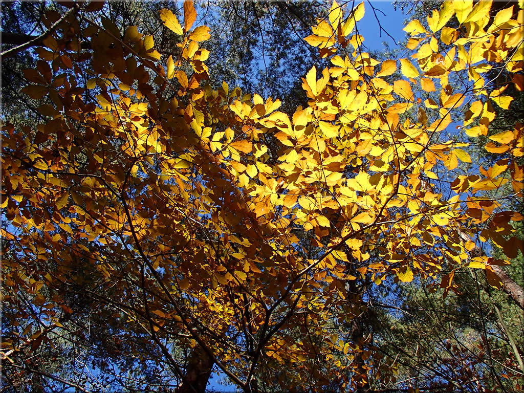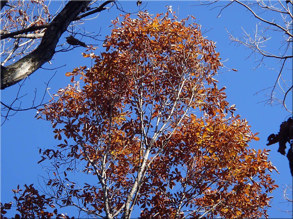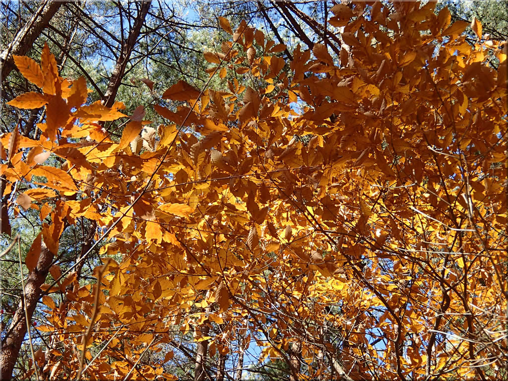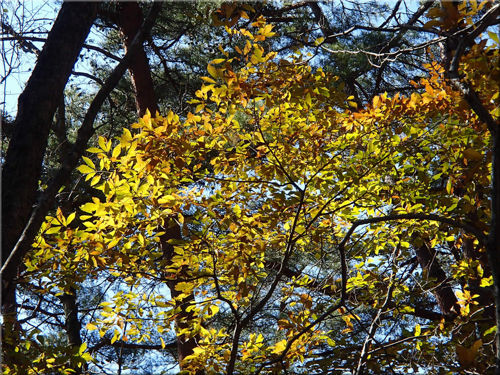広葉樹の黄葉は麓でももう終盤でしたが、でもまだ日射しが当たると明るく輝く黄葉がちらほらあり、そのたびに思わず足を止めてぱちり。