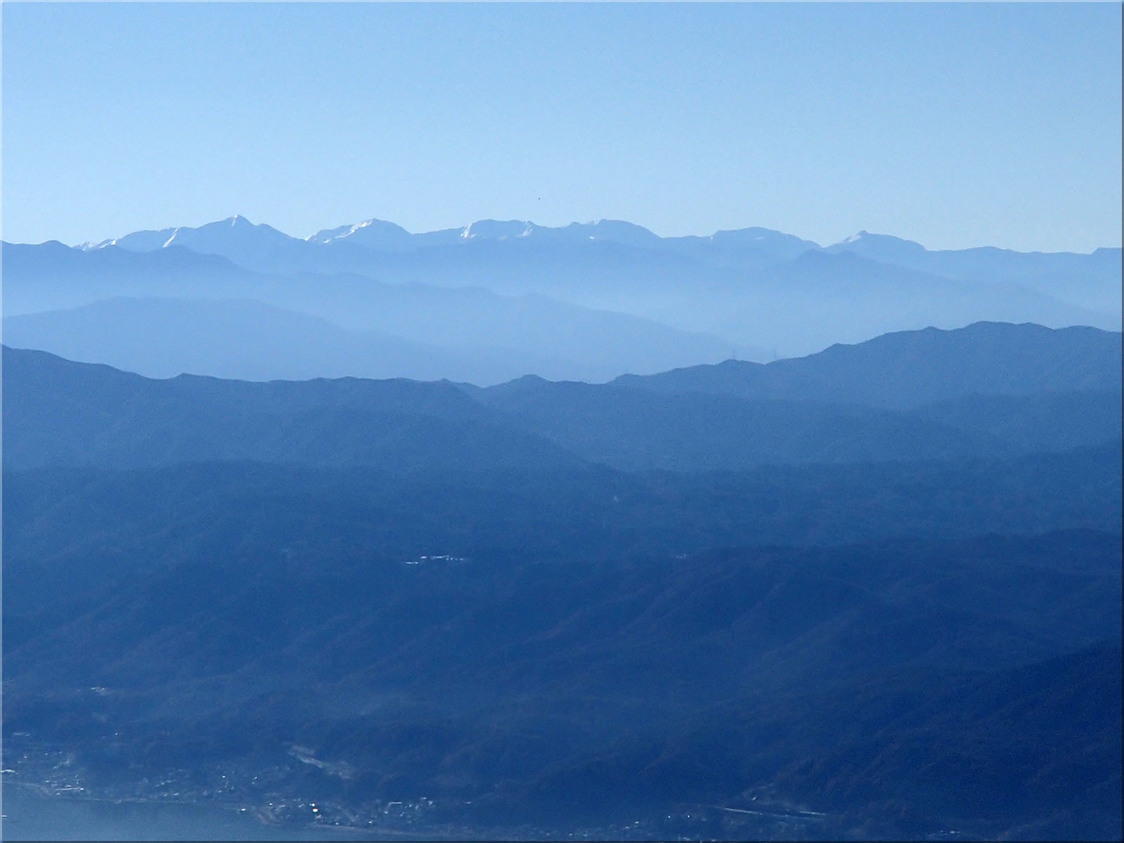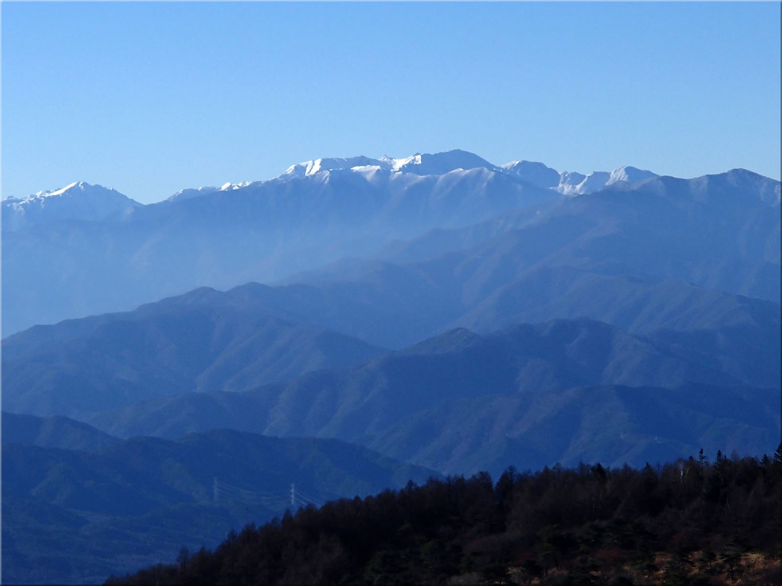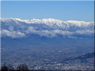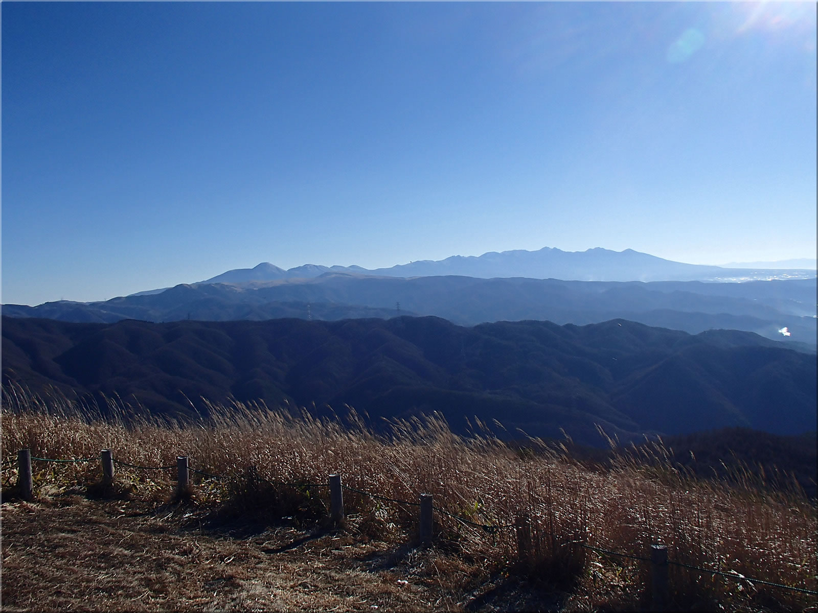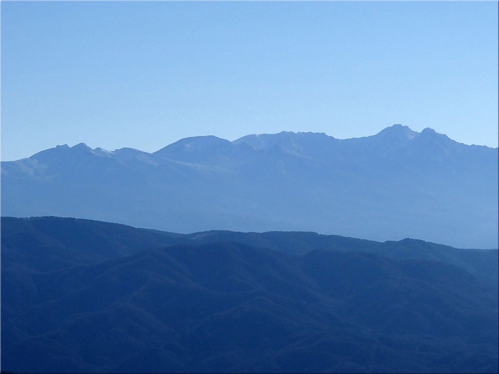 朝登った高ボッチ方面。北アルプスも槍、常念岳などが見えています。